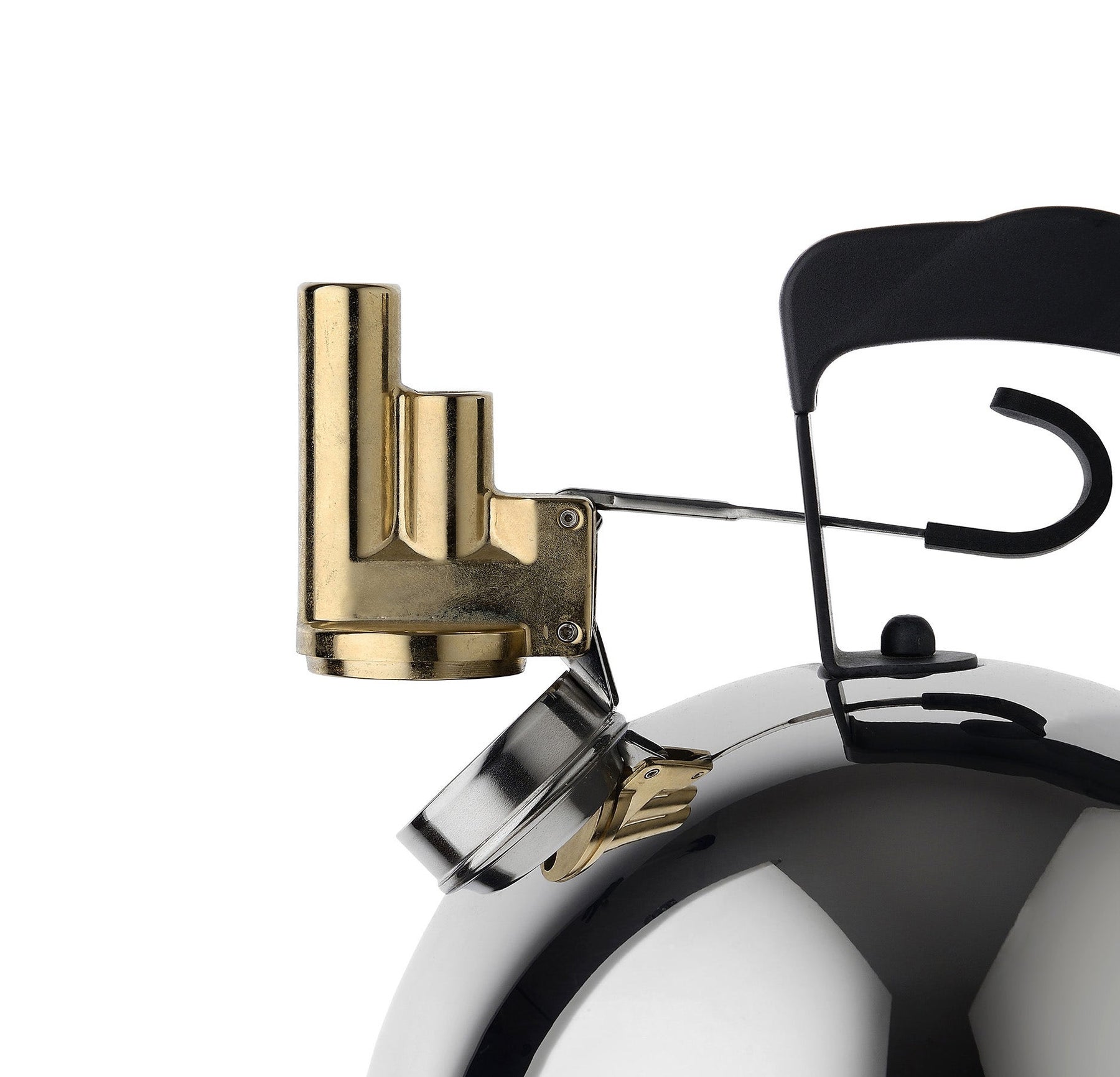 Kettle in stainless steel mirror polished with melodic whistle in brass and handle in PA, black. Magnetic steel heat diffusing bottom. This kettle was Alessi's first designer kettle, heralding a new season of kettle ideas for Alessi and many others.