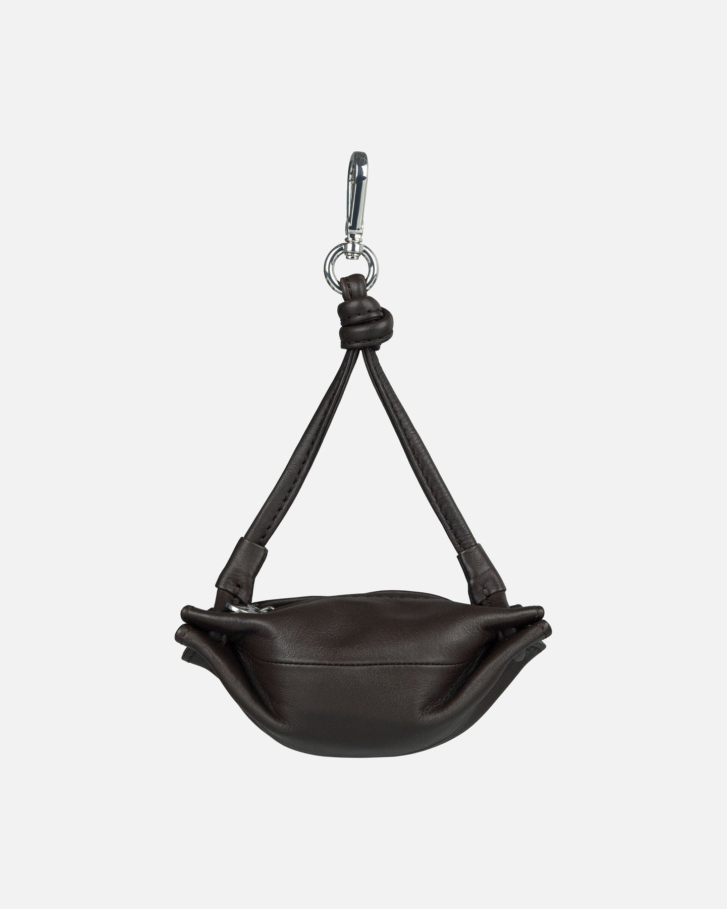 The candy wrapper inspired Karla Pocket pouch is made of leather. The tiny pouch has a zipper closure, a short, narrow strap, and a metal clip.