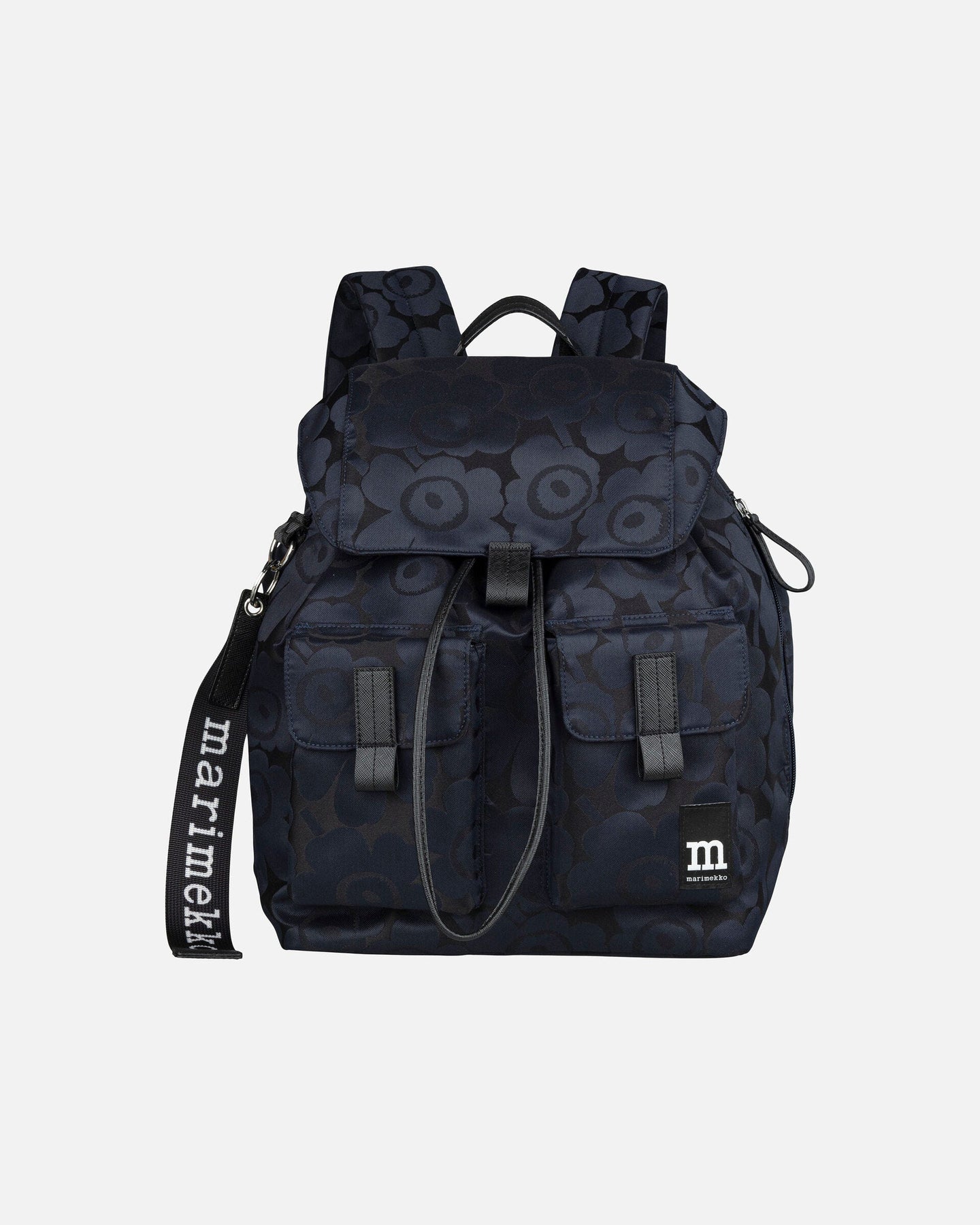 The large Everything Backpack L is made of polyester with the jacquard knit Unikko pattern. The backpack has a drawstring closure, a front flap with a magnetic button closure, and two front pockets with magnetic button closures. The adjustable shoulder straps are padded. There is a long zipper pocket on one side, and the Marimekko keychain on the other. The inside features a large pocket suitable for a laptop. The back panel is padded.