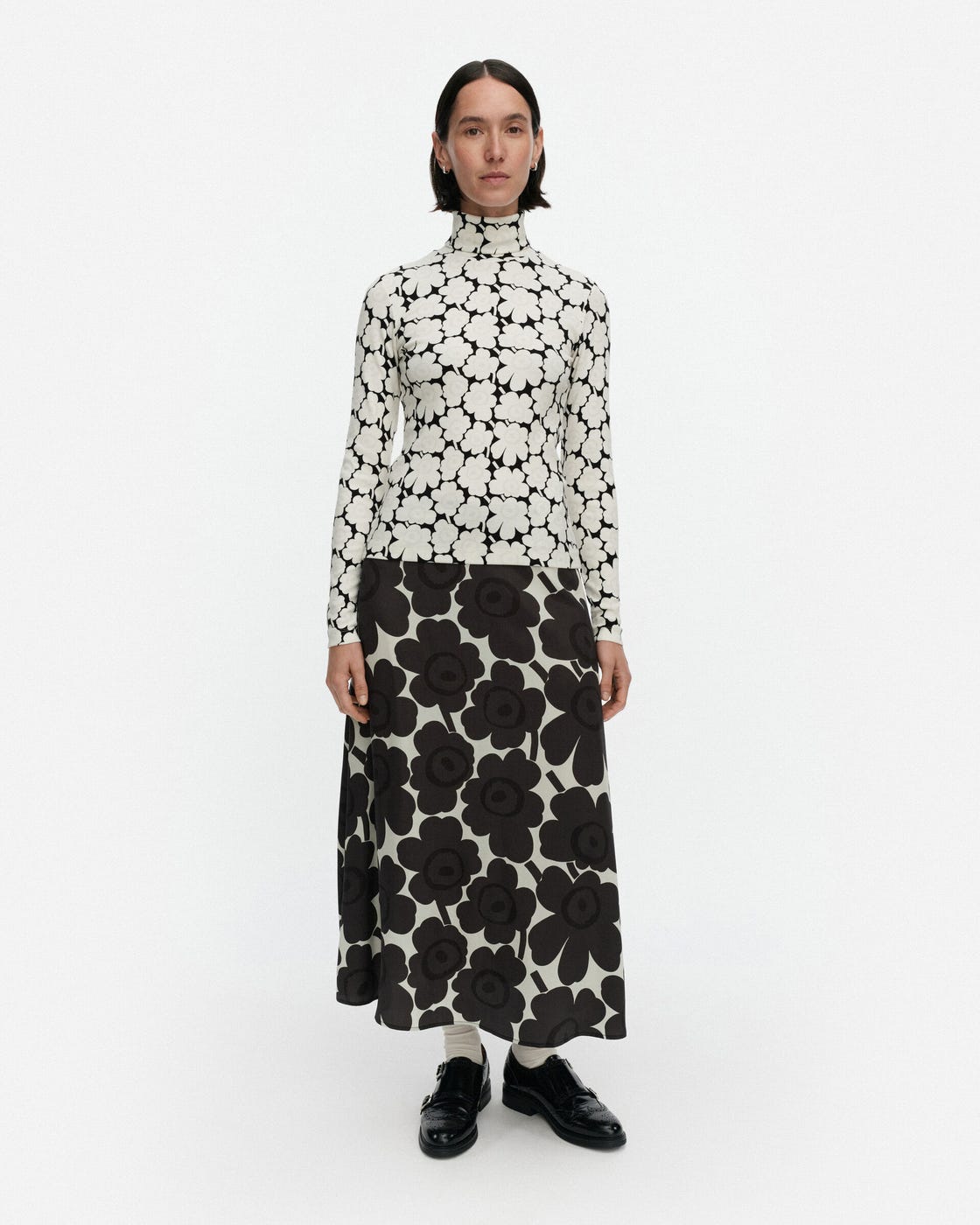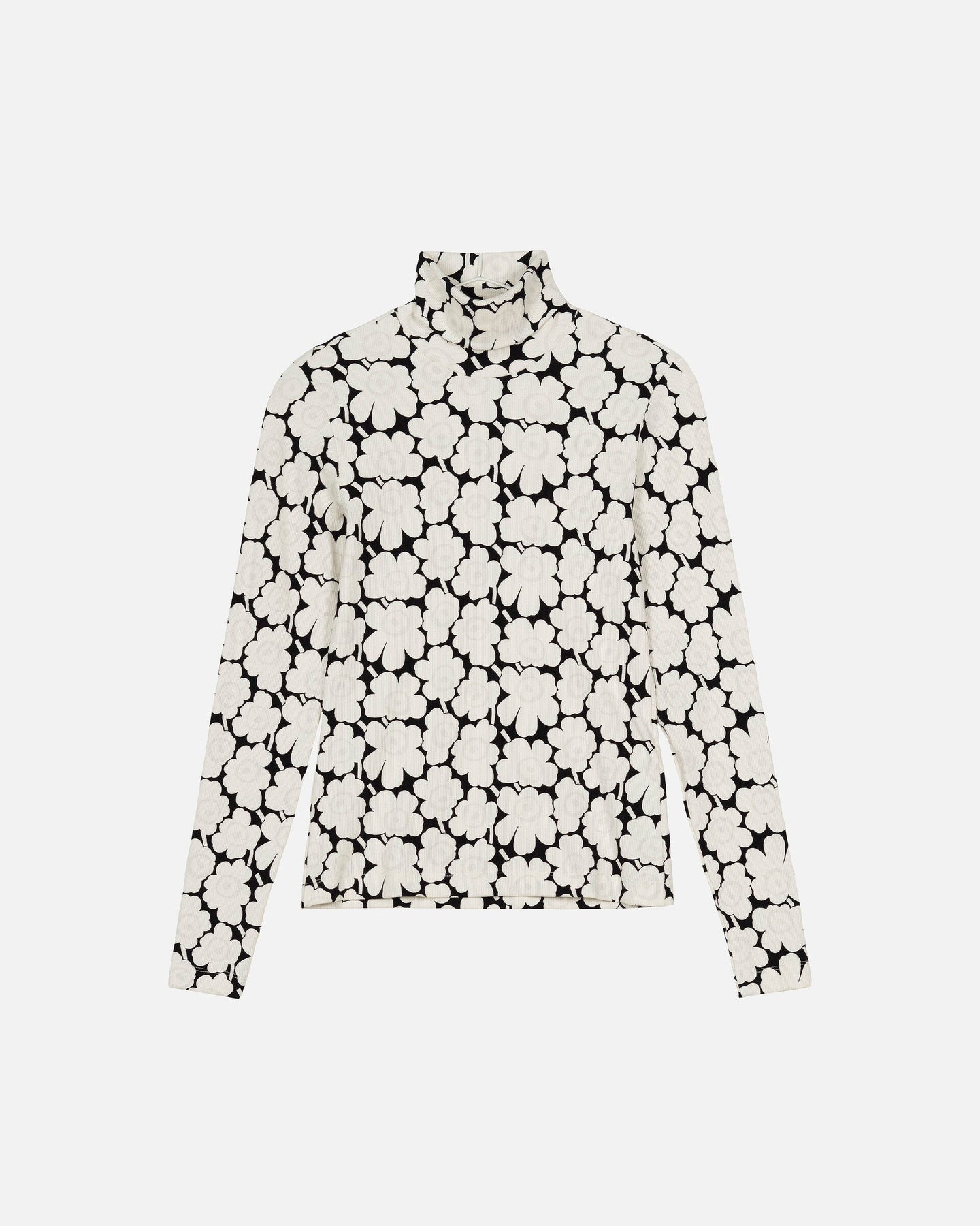The Emali turtleneck top is made of cotton rib jersey, and it has a skinny fit. The long-sleeved top is printed in the Unikko pattern, and it has a turtleneck collar that is folded over twice. .