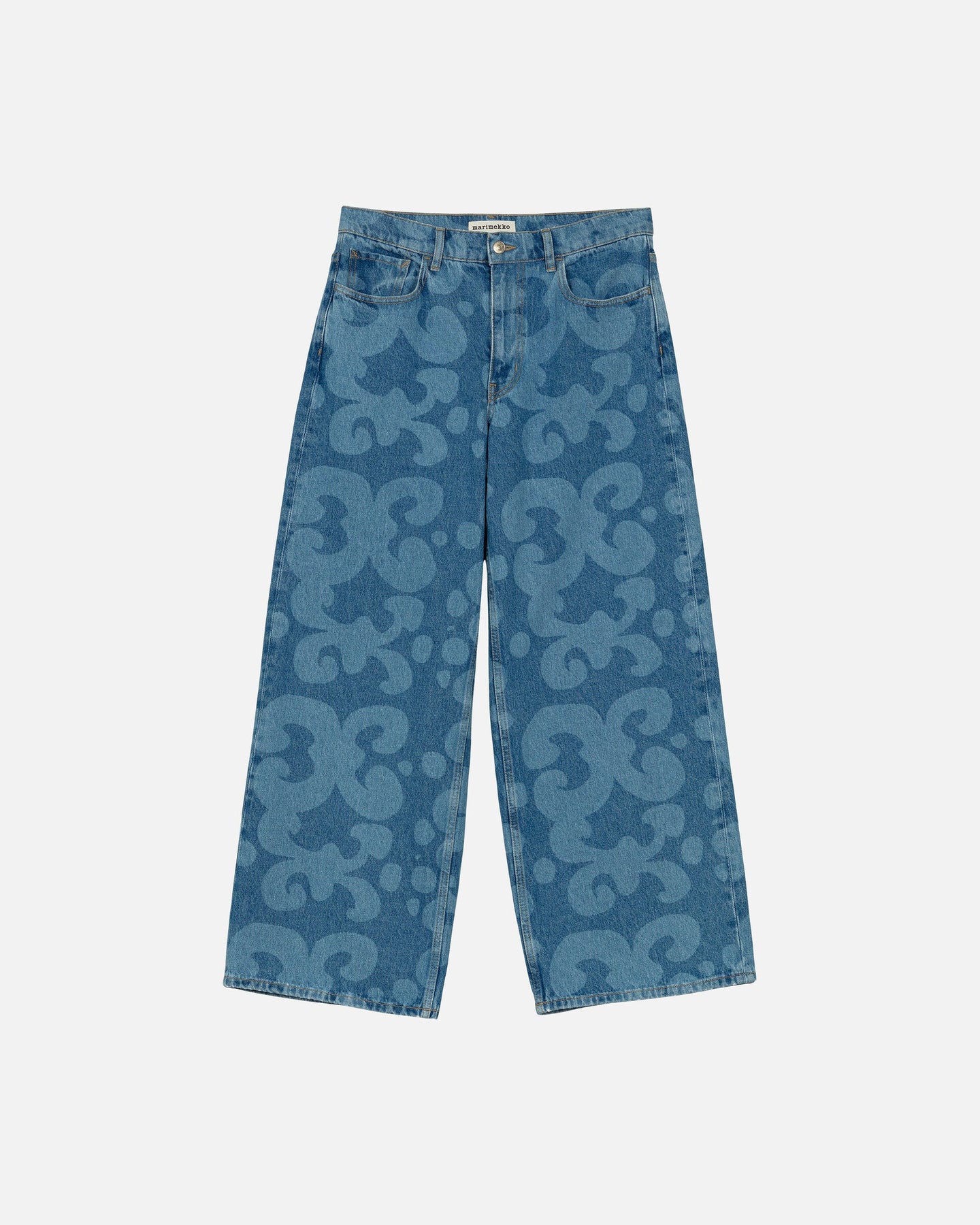 The used indigo Maridenim Loose jeans are made of non-stretch cotton denim in the Keidas pattern. The 5-pocket jeans have a slightly lowered waist and crotch, a relaxed fit, and wide, full-length legs. The jeans have Marimekko jean buttons and the Marimekko jean label in the back, which is made of FSC-certified jacron-material.