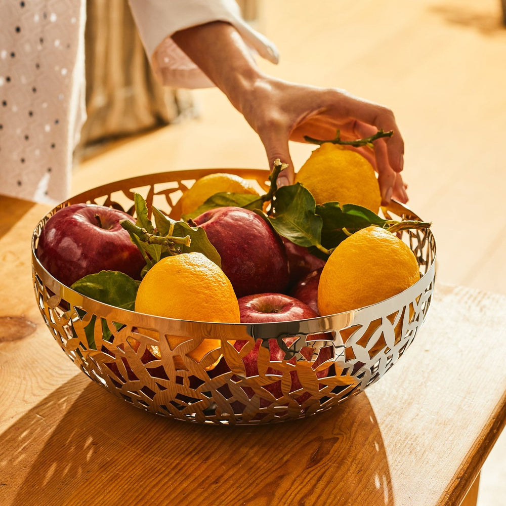 Distinctive for its fretwork, which represents a series of irregularly overlapping leaves, this fruit holder is part of a successful series of tableware items.