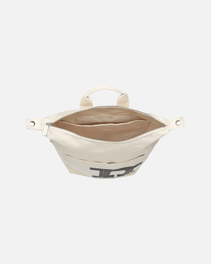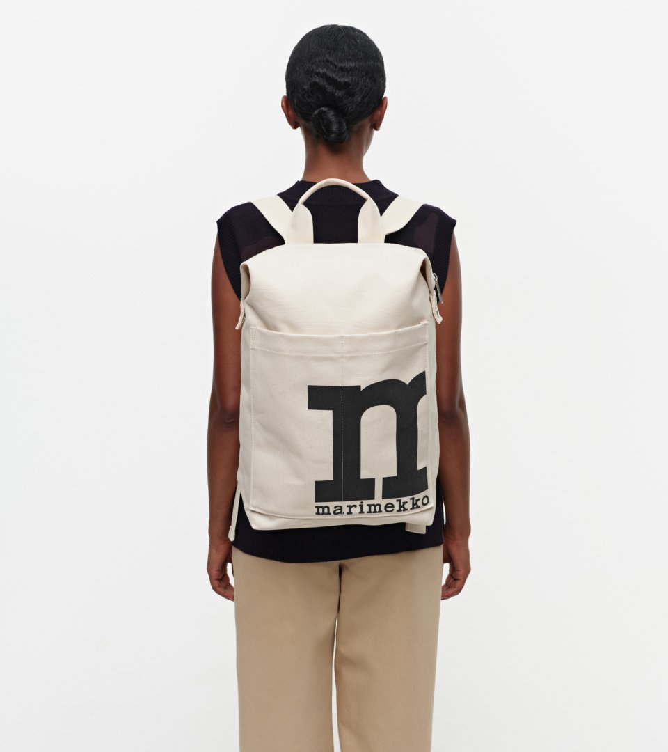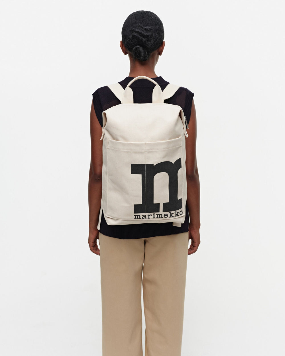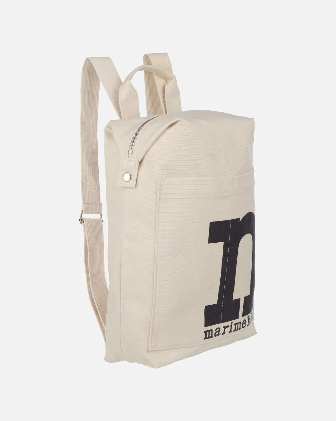 The Mono Backpack is made of unbleached organic cotton which is printed in Helsinki. The backpack has a zipper closure, adjustable shoulder straps, and two open pockets on the front. There is a large open pocket on the inside big enough to fit a laptop. The ends of the zipper can be attached to the sides of the bag with snap buttons.