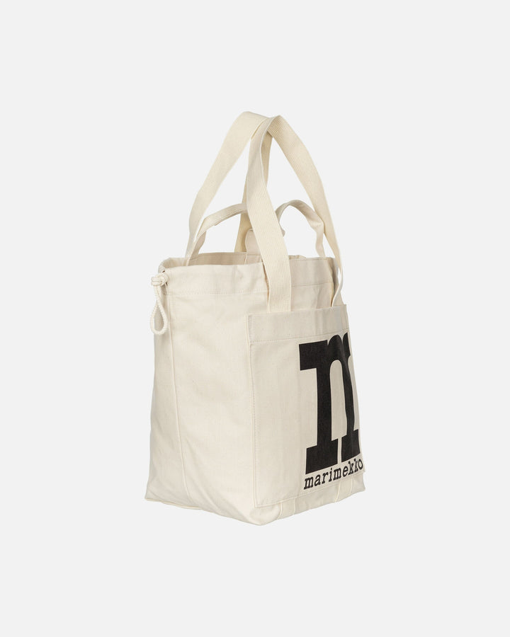The Mono City Tote is made of unbleached organic cotton which is printed in Helsinki. The bag has both short and long handles, and an open pocket on the outside. There are drawstrings at the sides that can be used to tighten the opening and change the silhouette of the bag.