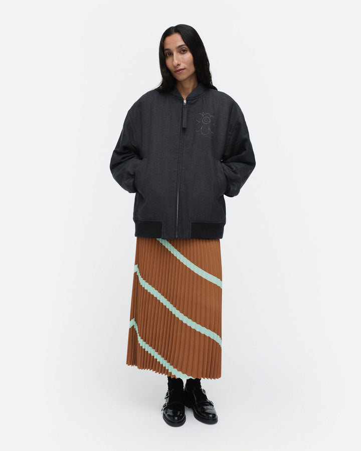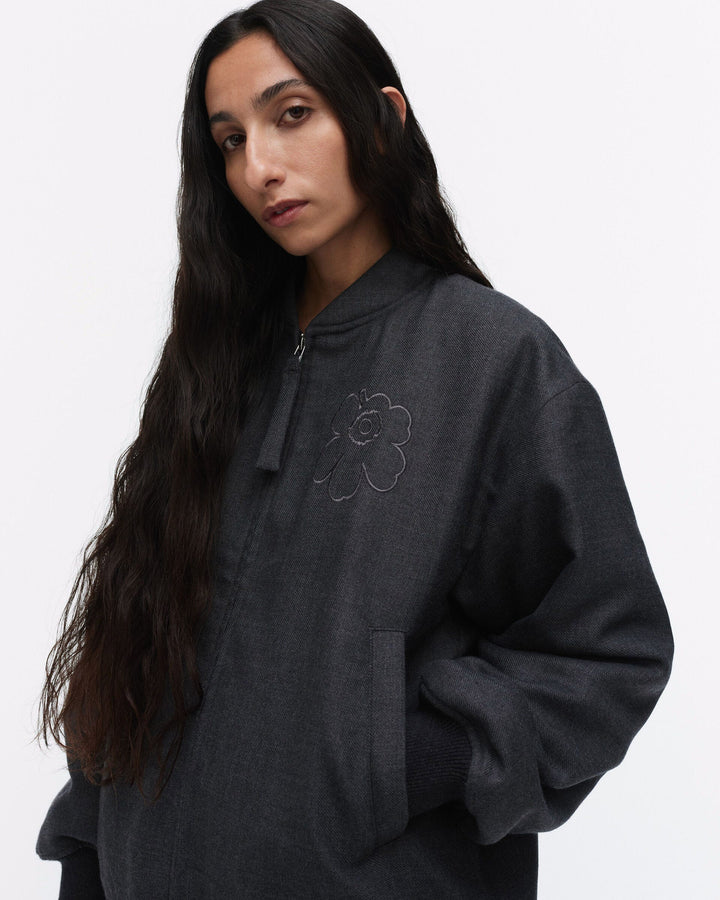 The Monumentti wool twill jacket has a relaxed, straight fit. The jacket has a padded standing collar, a metal zipper closure with a padded puller, and ribbing at the cuffs and hemline. The Unikko flower is embroidered onto the left chest and the jacket has list pockets. The jacket features a quilted inside lining.