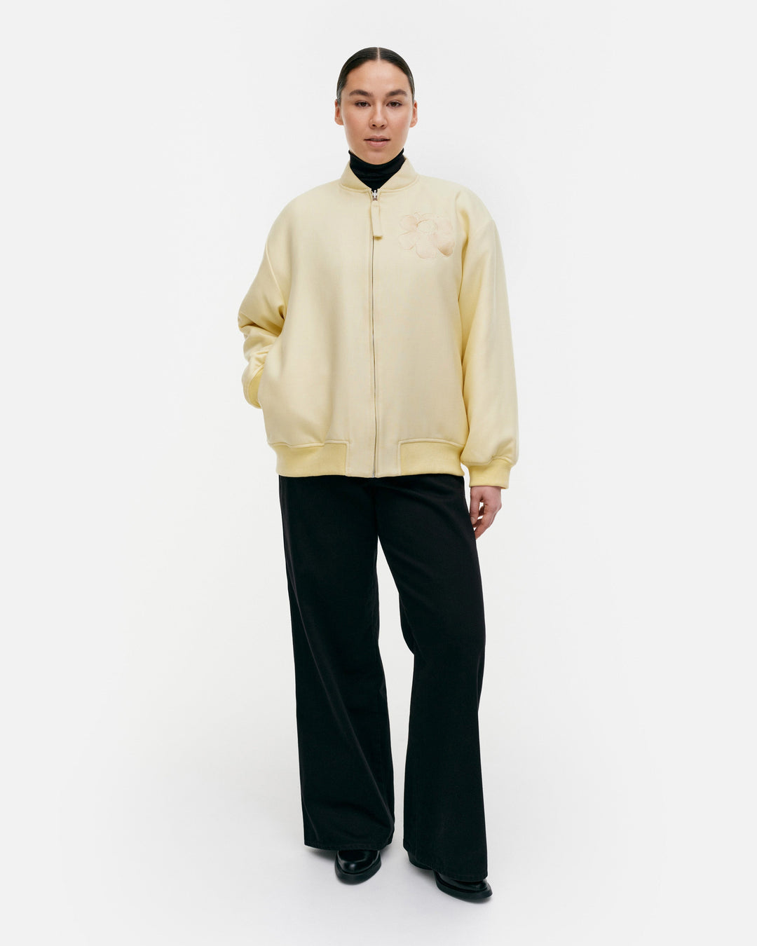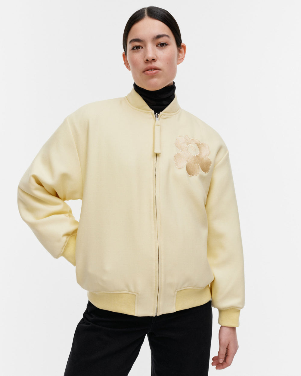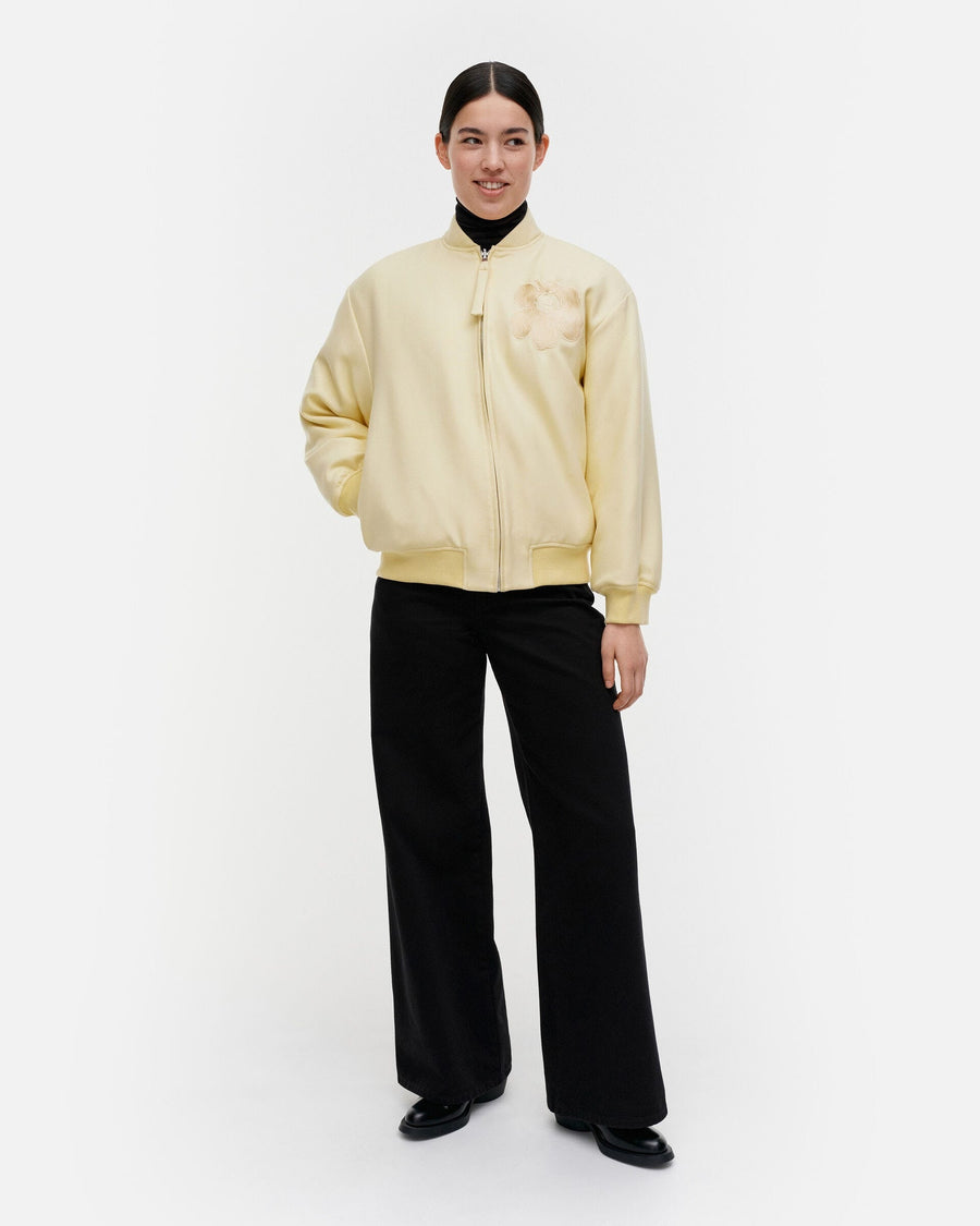 The Monumentti wool twill jacket has a relaxed, straight fit. The jacket has a padded standing collar, a zipper closure with a padded puller, and ribbing at the cuffs and hemline. The Unikko flower is embroidered onto the left chest and the jacket has side seam pockets. The filling and the quilted inside lining are made of recycled polyester.