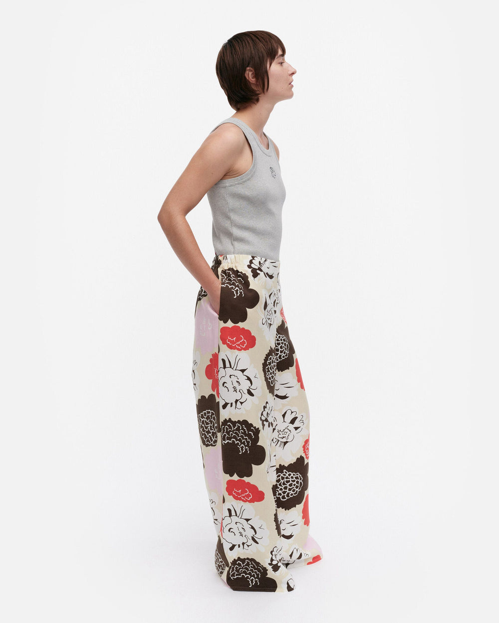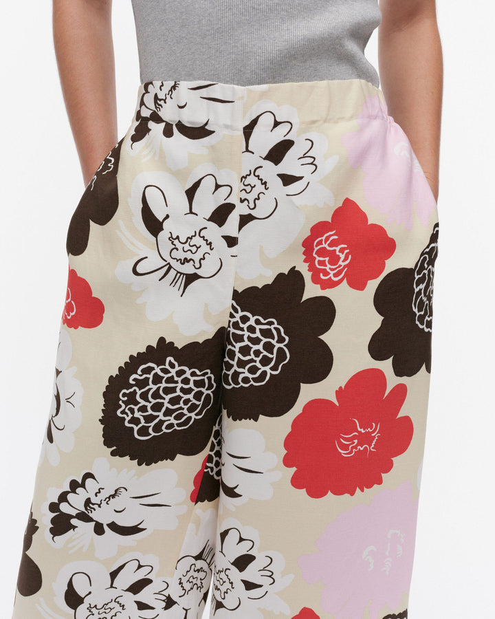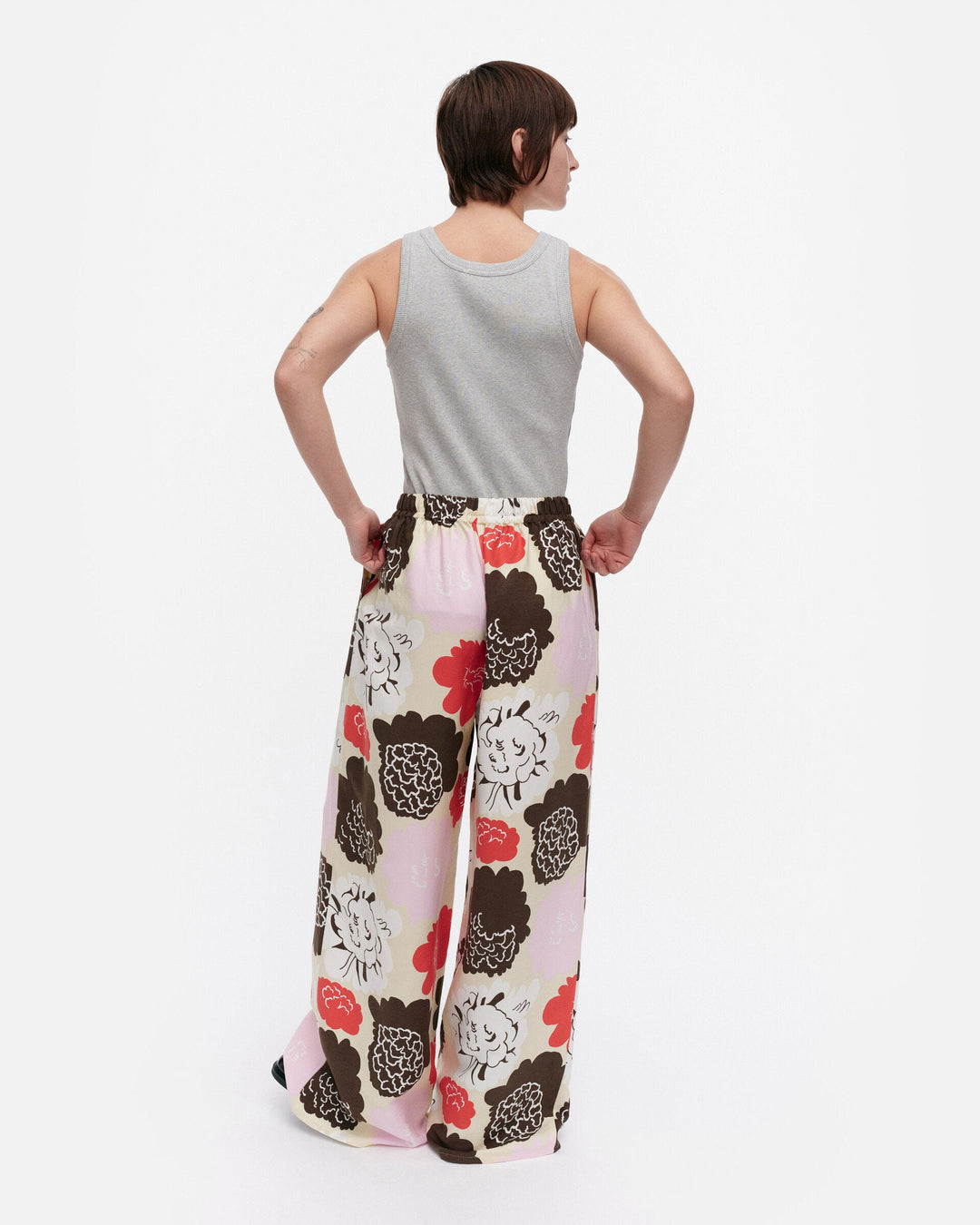 The Muotti trousers have a relaxed fit and straight, wide trouser legs. The trousers feature the Pioni pattern, an elastic gathered back waistline, and side seam pockets.
