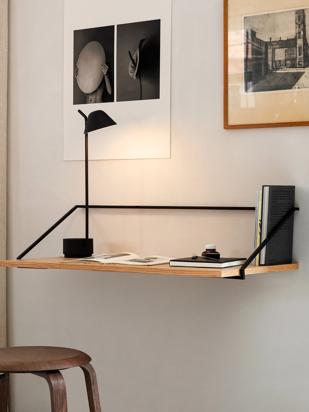 Daniel Schofield’s portable Ray Table Lamp for Audo Copenhagen has a distinctive silhouette inspired by old mining lamps. Its simplified design in powder-coated metal and glass features a practical top handle that makes it easy to carry the lamp to wherever light is needed – from a living room shelf or dining room table to a bedside cabinet.