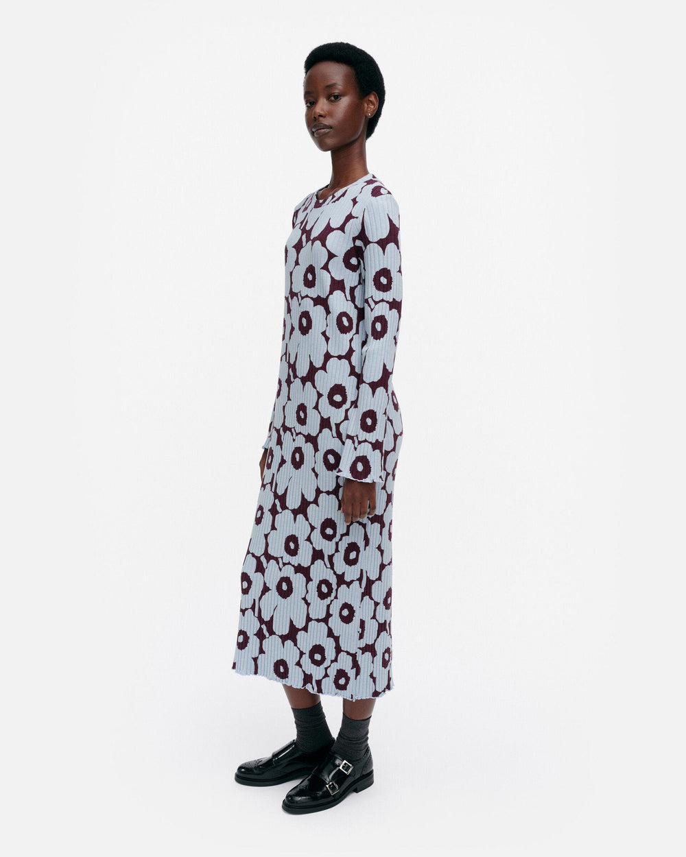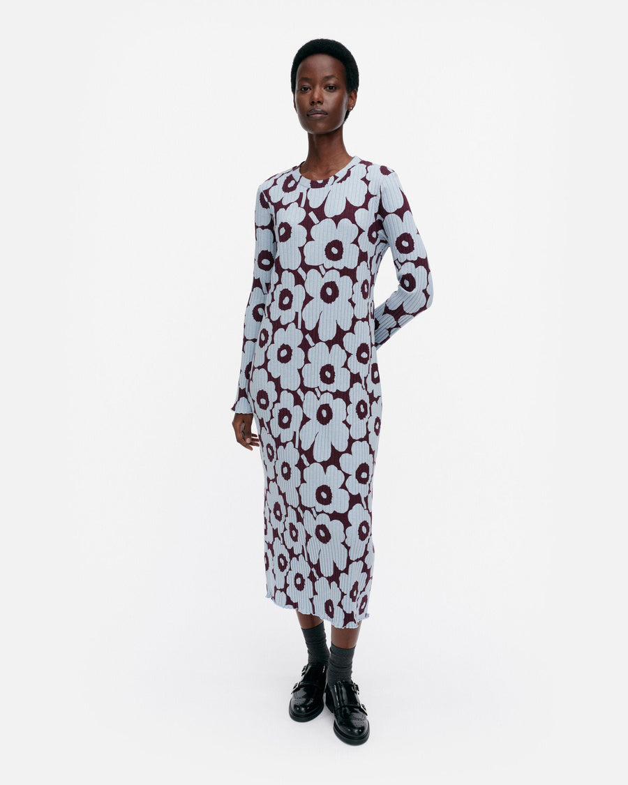 The Rulla rib jersey dress has a slim, straight fit and it features the Unikko pattern. The dress has an O-neck and long sleeves that widen slightly at the cuffs. The sleeve ends and the hem are finished with a narrow rolled hem.