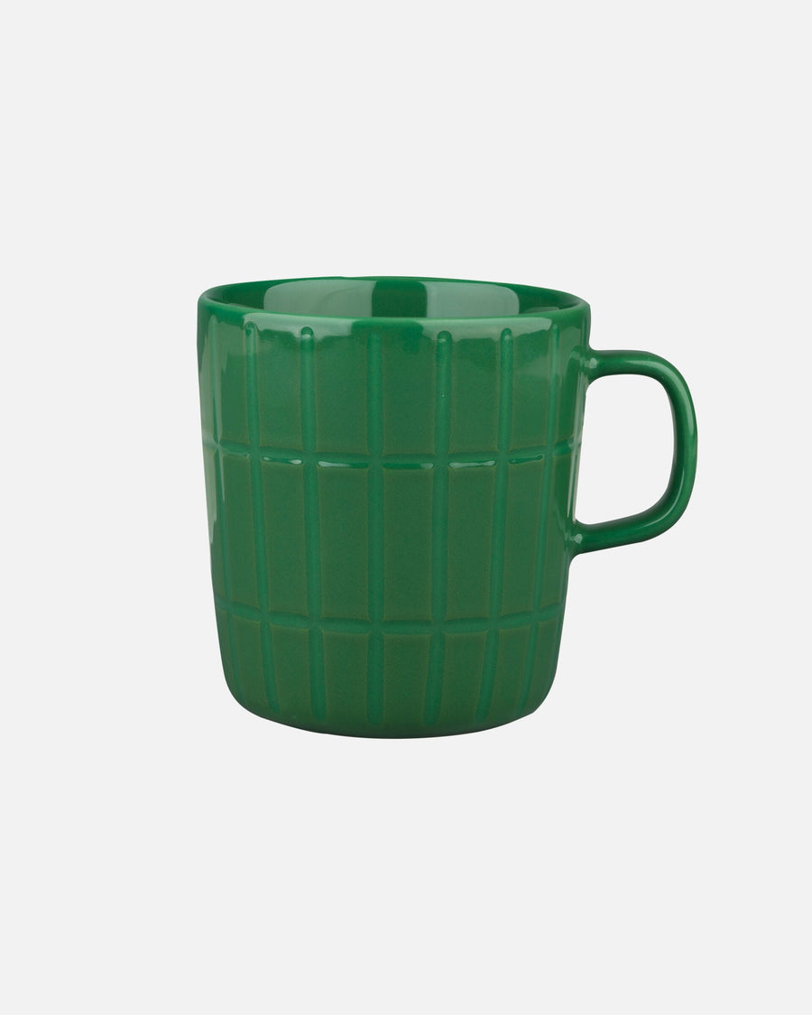 Oiva mug is made of dishwasher, oven, microwave and freezer safe white stoneware. The mug features the Tiiliskivi pattern made with a relief technique.