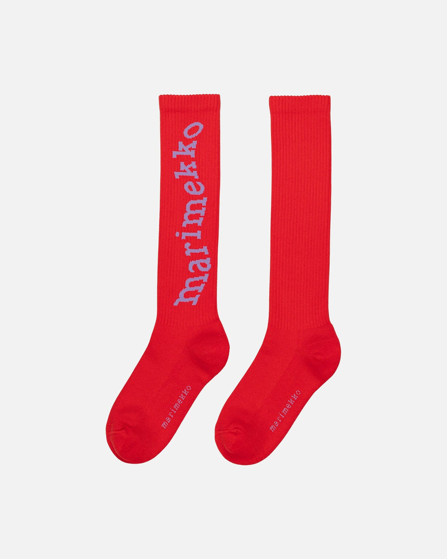 The Suikea knee high tennis socks are made of a cotton blend and boths socks feature the wavy Marimekko logo text and Vihkiruusu pattern flower.