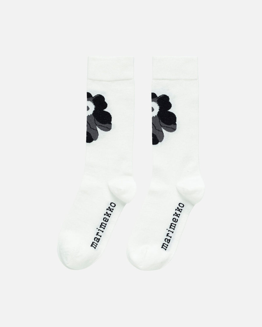 The Toimisto rib knit ankle socks are made of a cotton blend, and they feature one large Akvarelli Unikko pattern flower, which looks like it was painted with watercolours. Socks has Marimekko logo text on the bottom of socks.