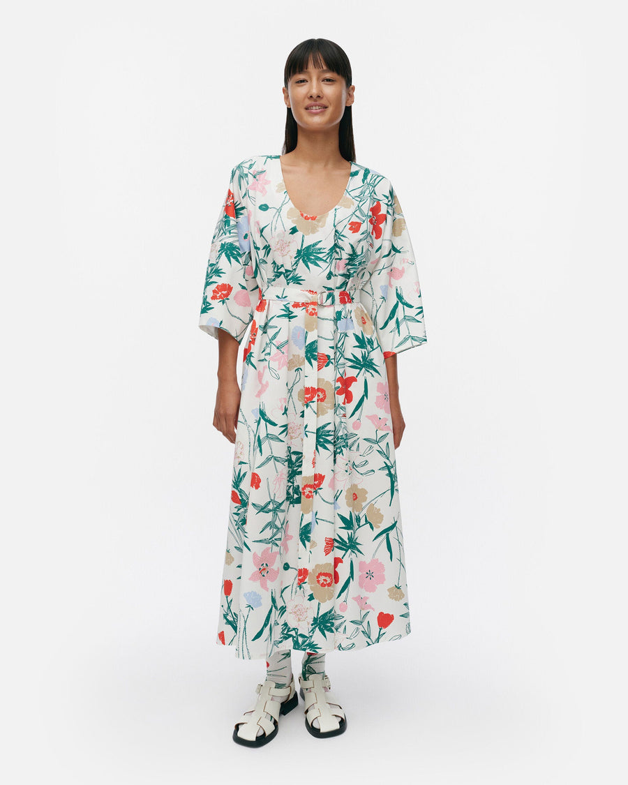 The Hymy dress is made of organic cotton twill, and it has a relaxed fit, a straight top, and a flared cut hem. The product contains 4% elastane. The dress features the Perenna pattern, which is printed in Helsinki. It has a scoop neck and cropped kimono sleeves with a rounded shape and wide turn-ups at the cuffs. There are pockets in the side seams and the dress comes with a separate D-ring belt.