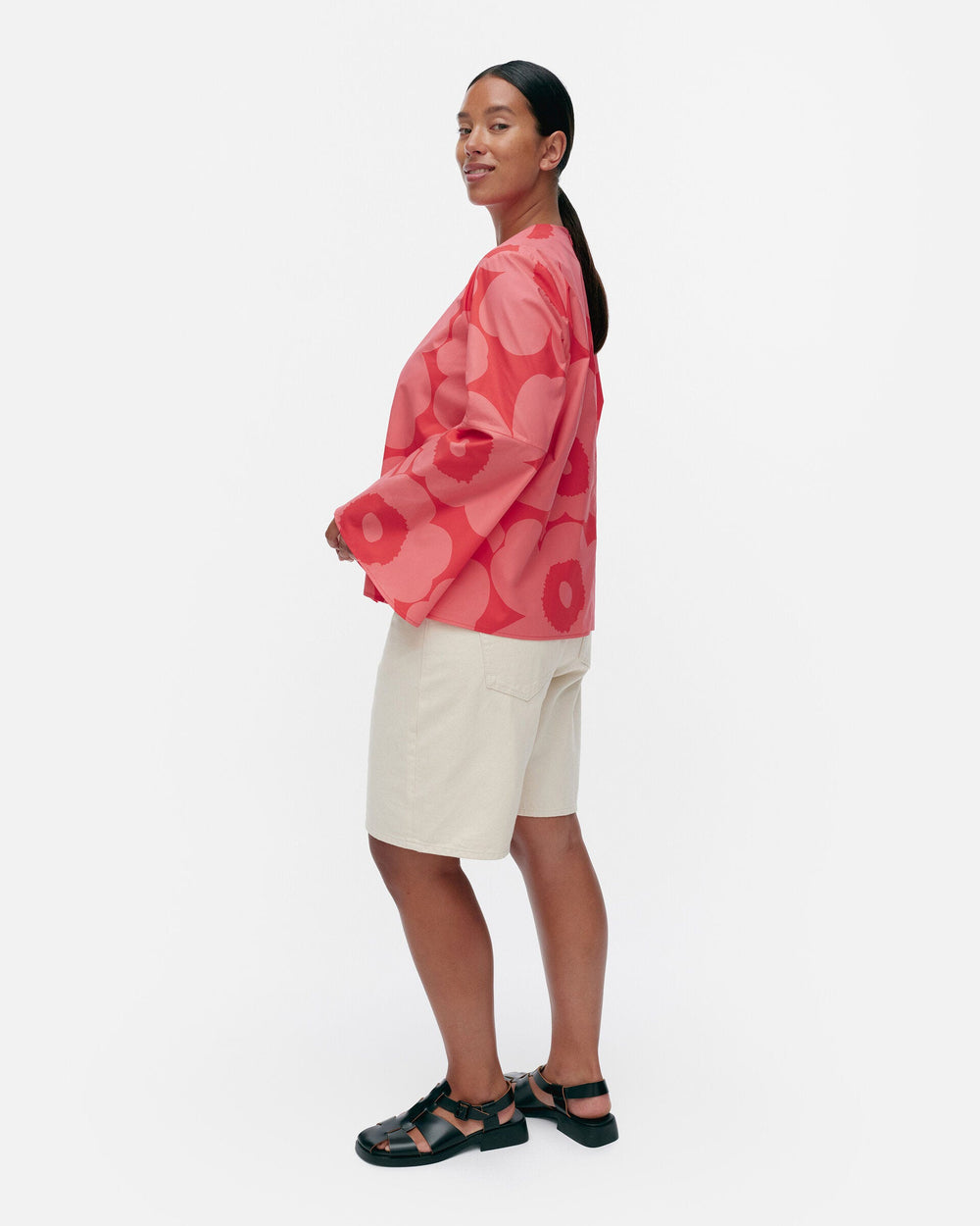 The Pelargoni blouse is made of organic cotton poplin, and it has a slim, straight fit. The blouse features the Unikko pattern, an O-neck with a concealed zipper in the back seam, and long trumpet sleeves.