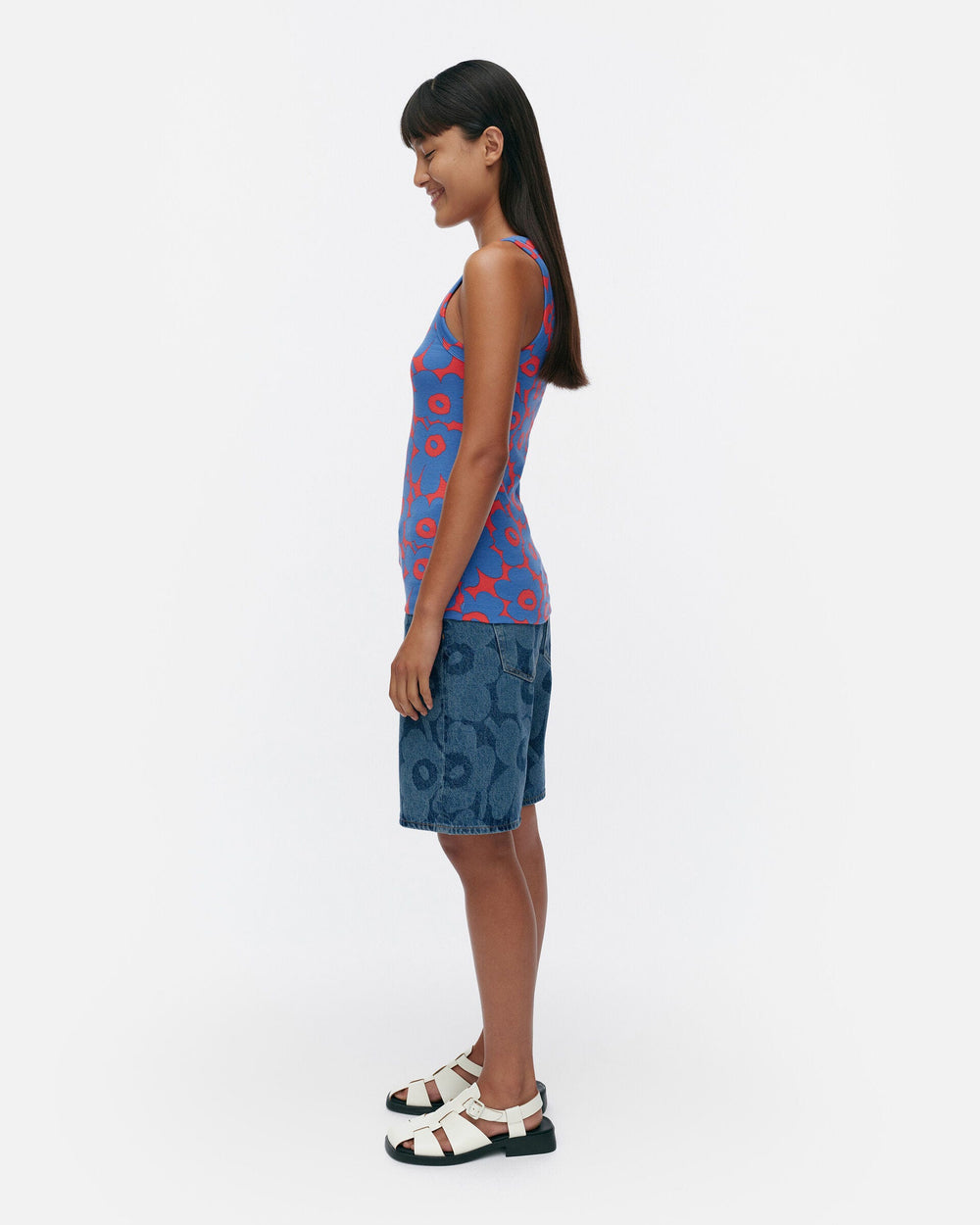 The Uusia tank top is made of organic cotton rib jersey, and it has a skinny fit and the Unikko pattern. The product contains 5% elastane.
