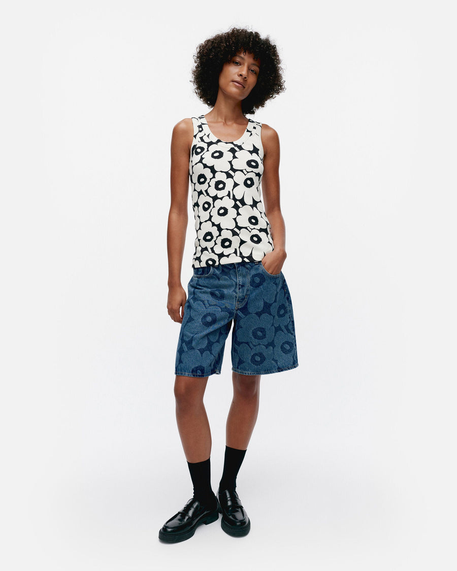 The Uusia tank top is made of organic cotton rib jersey, and it has a skinny fit and the Unikko pattern. The product contains 5% elastane.