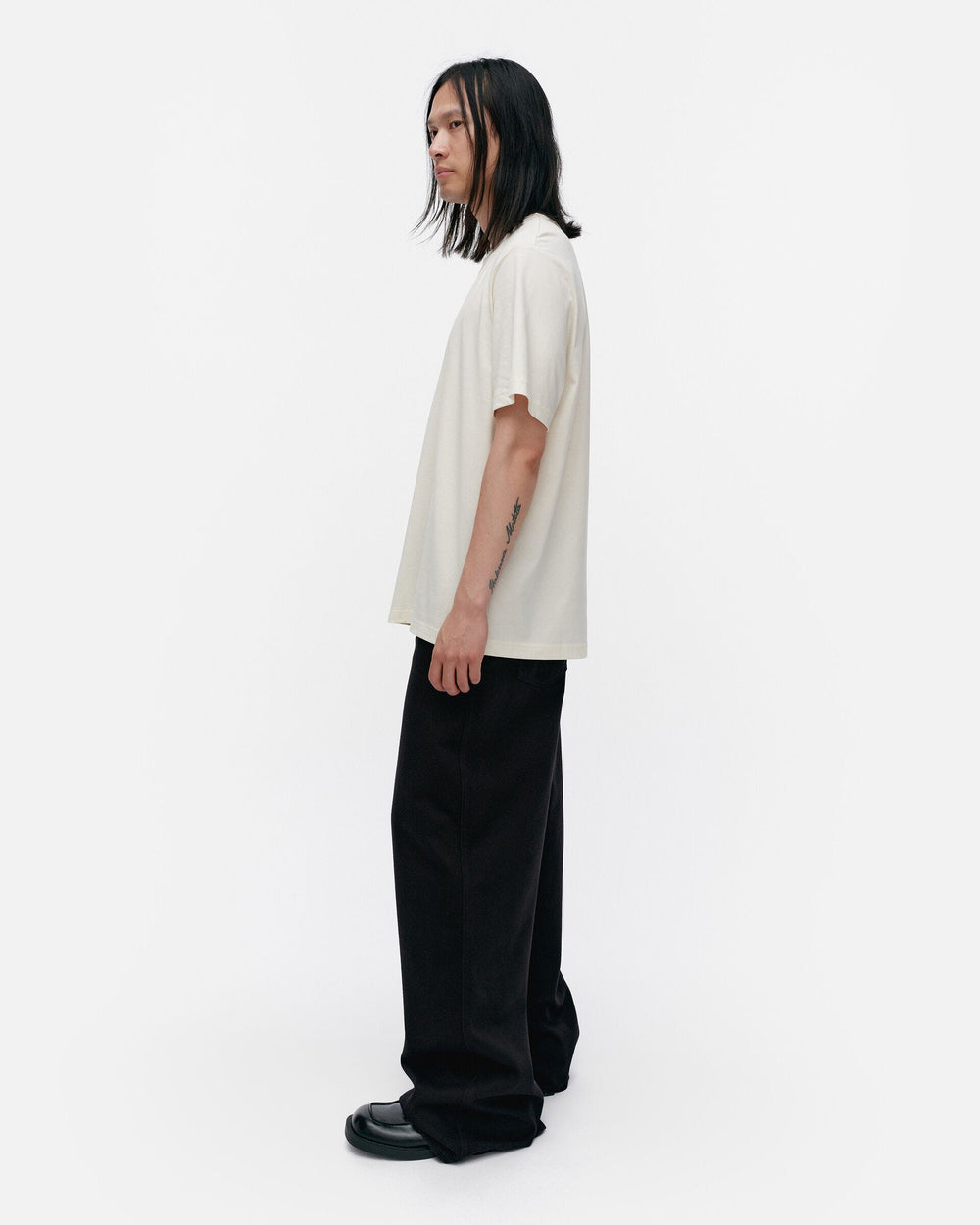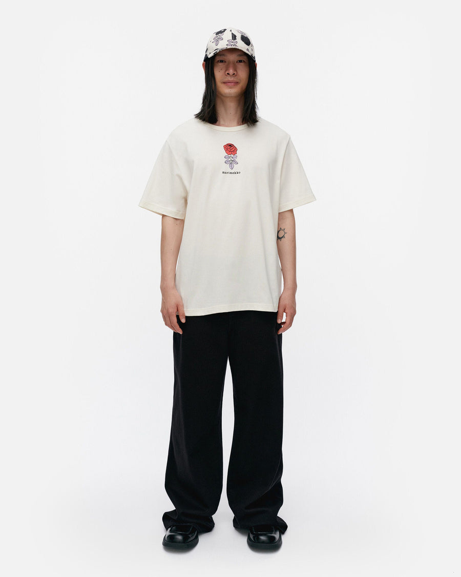 The Vihne t-shirt is made of organic cotton jersey, and it has a unisex fit. The t-shirt features the placement print Vihkiruusu flower and the Marimekko logo in the front and a ribbed O-neck.