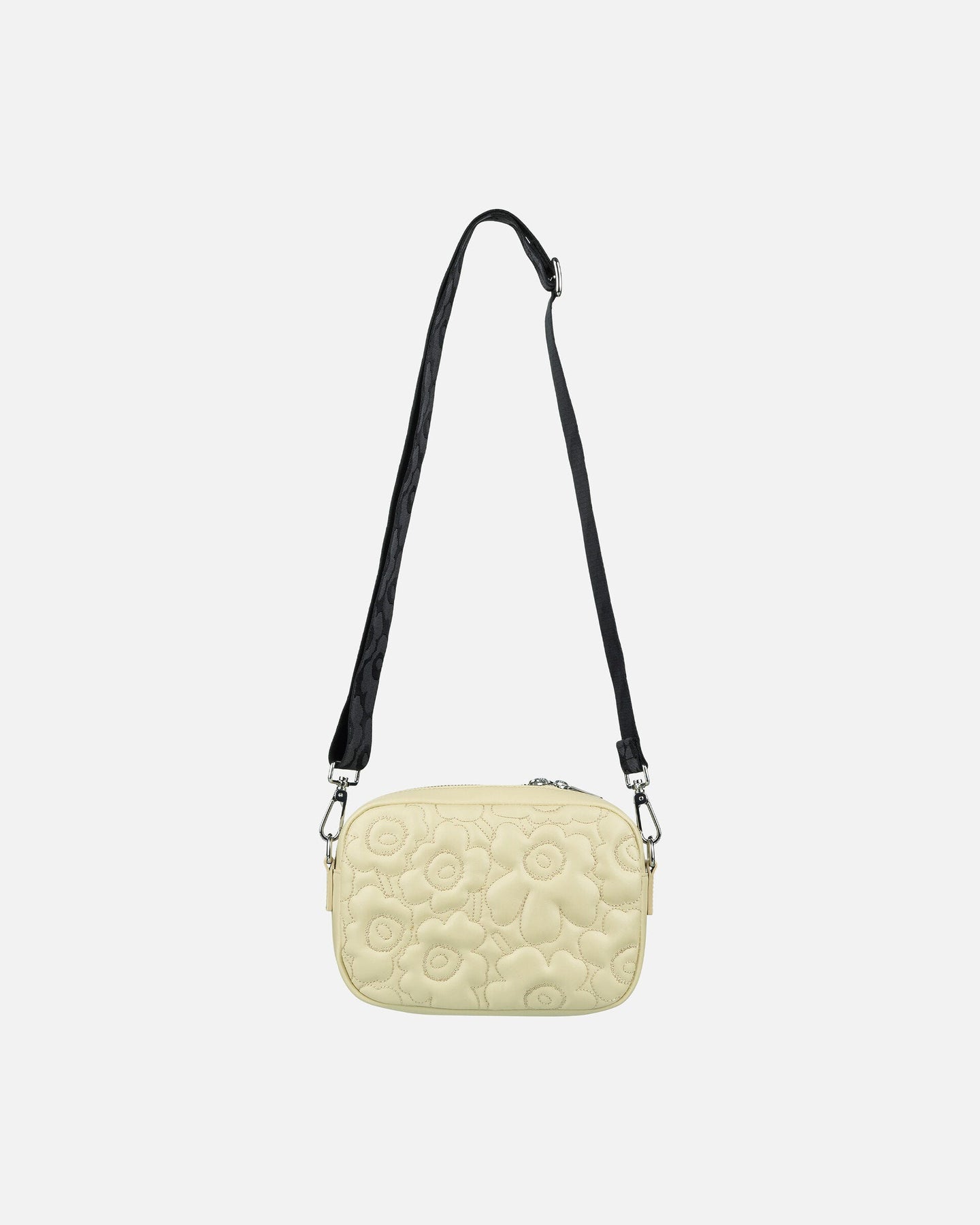 The Soft Gratha shoulder bag is made of padded leather with a metallic foil, and it features the quilted Unikko pattern. The bag has an adjustable and detachable, jacquard knit Unikko pattern shoulder strap. The bag has a zipper closure with one Unikko puller and a zipper pocket on the inside.