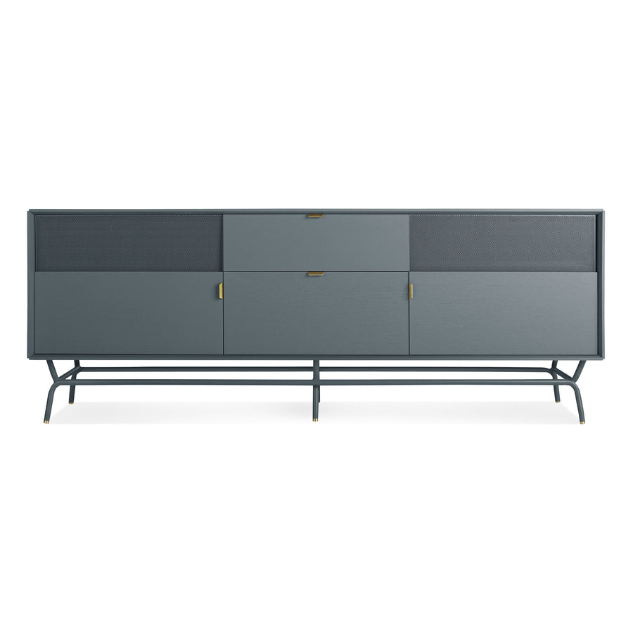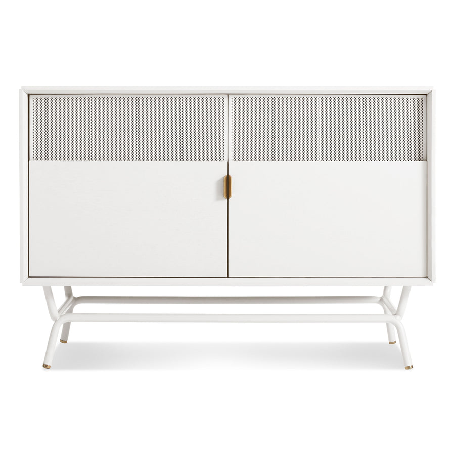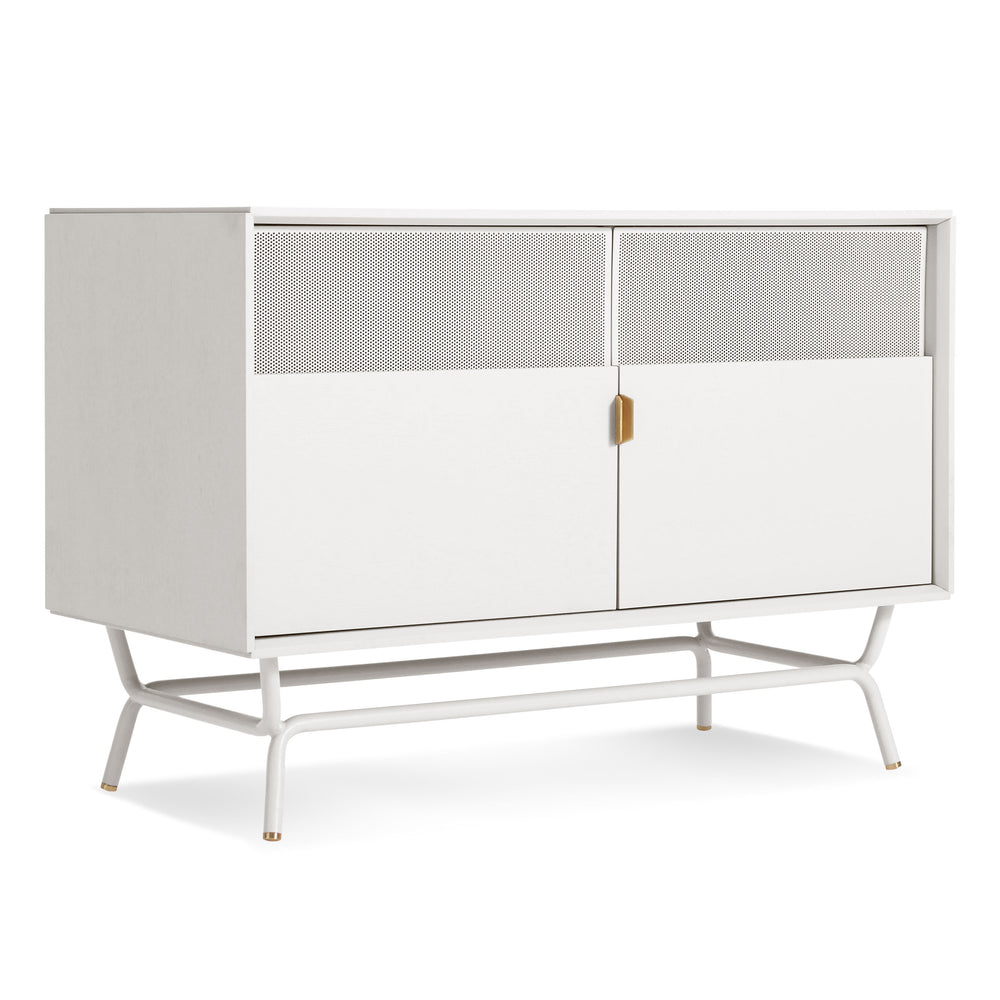 Perforated steel door front allows use of remotes without spoiling the view. Brass details and powder-coated steel base.