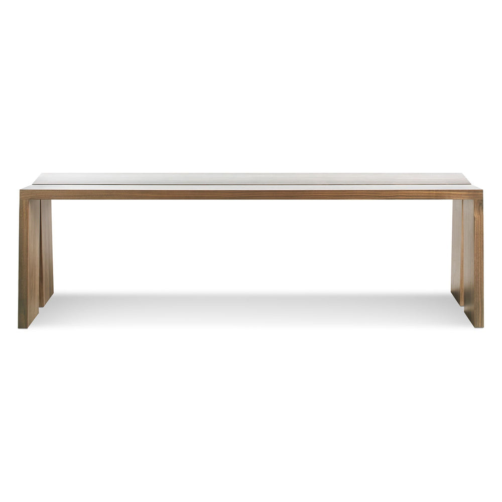 Two angled solid wood planes are unified by brass brackets to create an unexpectedly comfortable seat. The uncomplicated form is suitable for use in any room - entryway, dining room or bedroom. Steel brackets and adjustable glides for levelling.