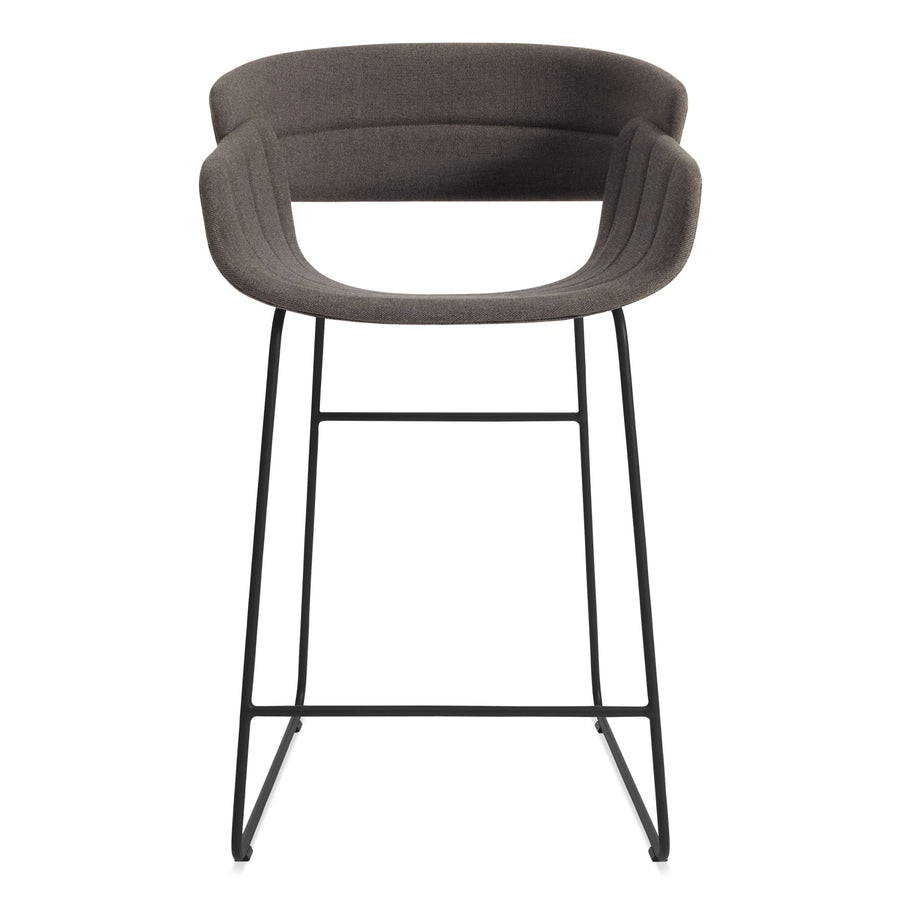 An upholstered seat and back work the curves and overlap just so to create a chair that invites you to sit down and stay awhile. The channel stitch detail may not improve the aerodynamics but it sure does looks swell. With a colour coordinated powder coated steel sled base.