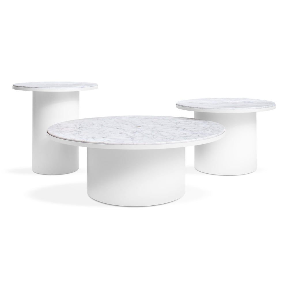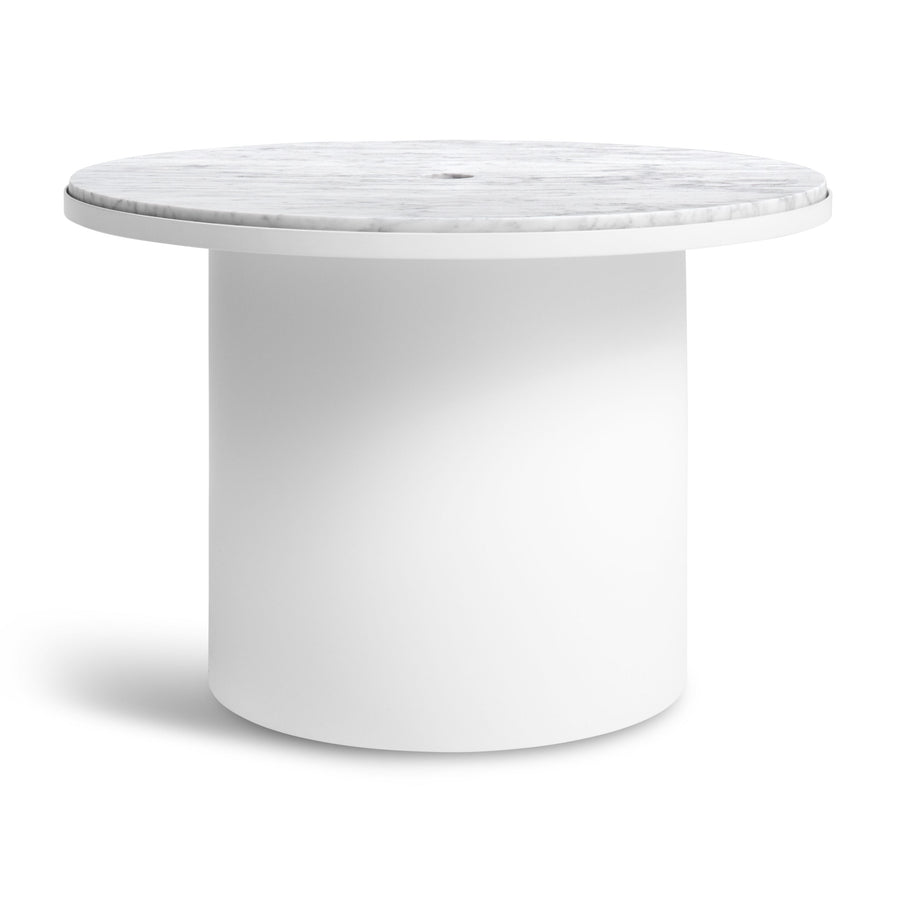 A polished wheel of Carrara marble sits on a tidy steel base for an effect that is loaded with low key elegance.