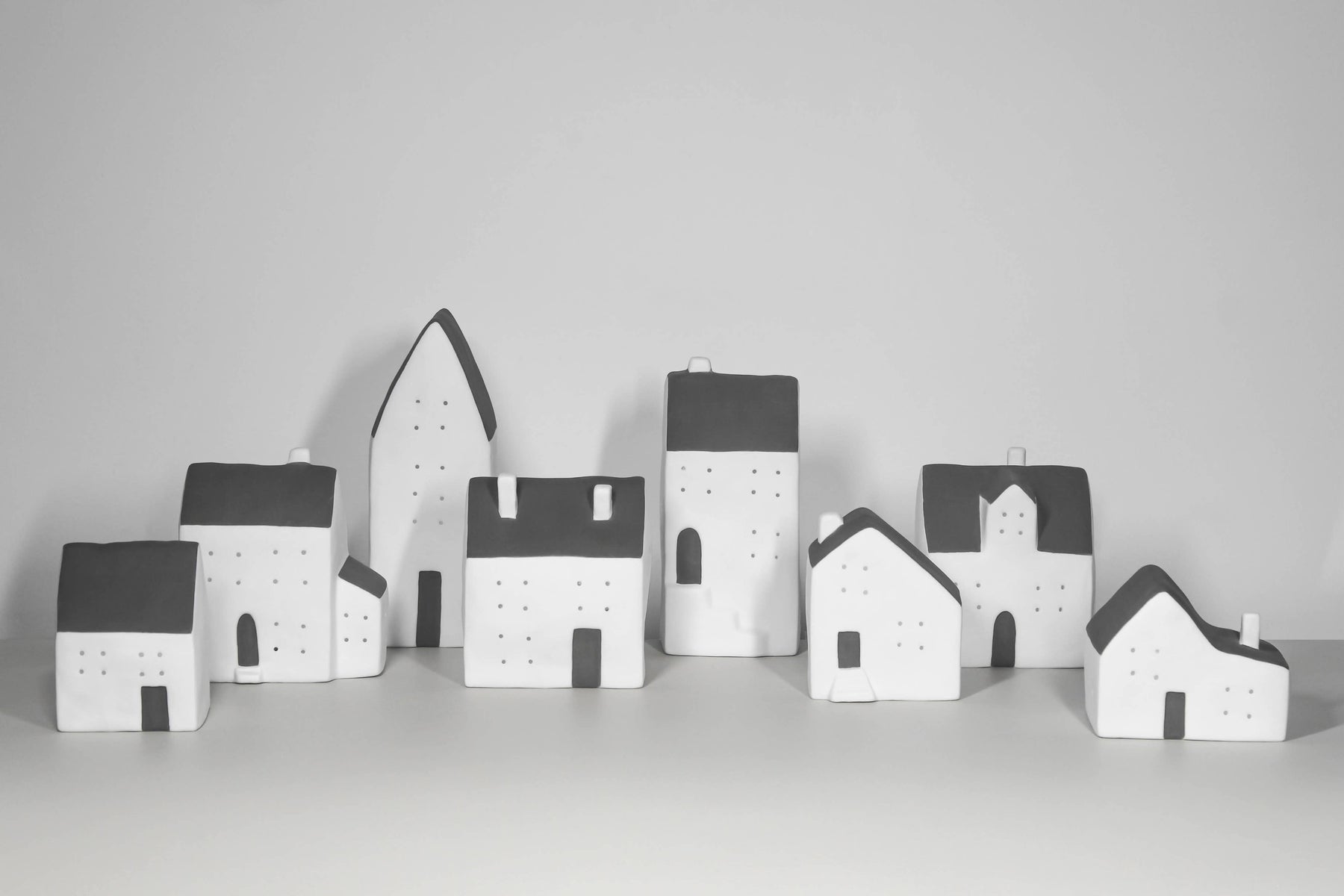 A selection of Ceramic Houses with LED in a simple yet effective colour combination of white and grey and available in a variety of shapes and sizes.