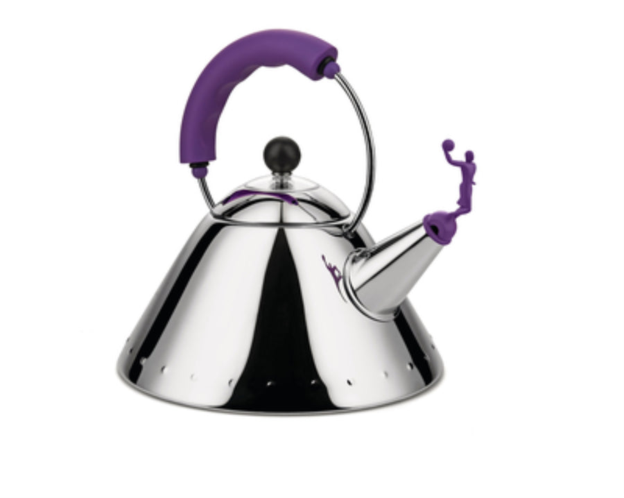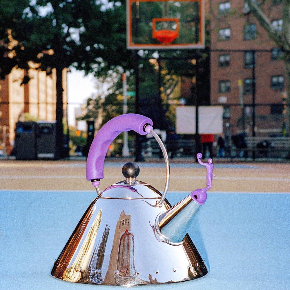 The 3909 kettle mixes different cultural aspects: the phenomenon of basketball and its multicultural imagery, an integral part of Abloh's personal history, with the world of design and its codified references. The whistle is completely redesigned, taking the form of a basketball player who crushes with power to the basket, while the colors of the handle and the knob are lit with an intense purple.