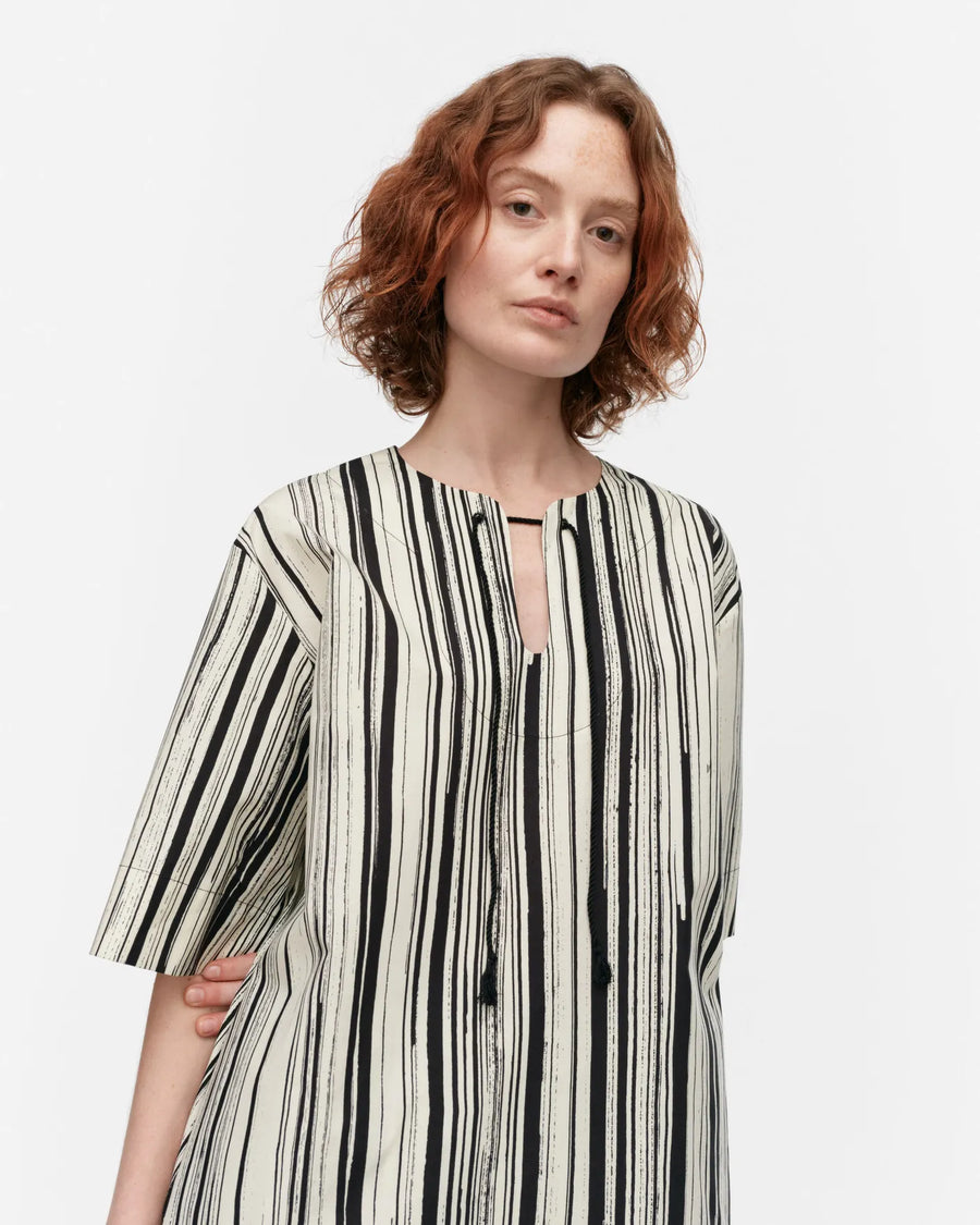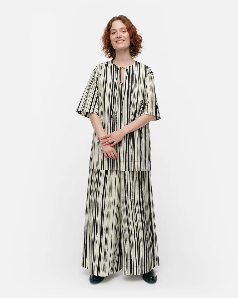 The Jiiri blouse is made of organic cotton poplin, and it has a relaxed, straight fit. The blouse features the Siluetti pattern, which is printed in Helsinki. The blouse has a teardrop keyhole neckline with drawstrings at the front and short, loose sleeves.