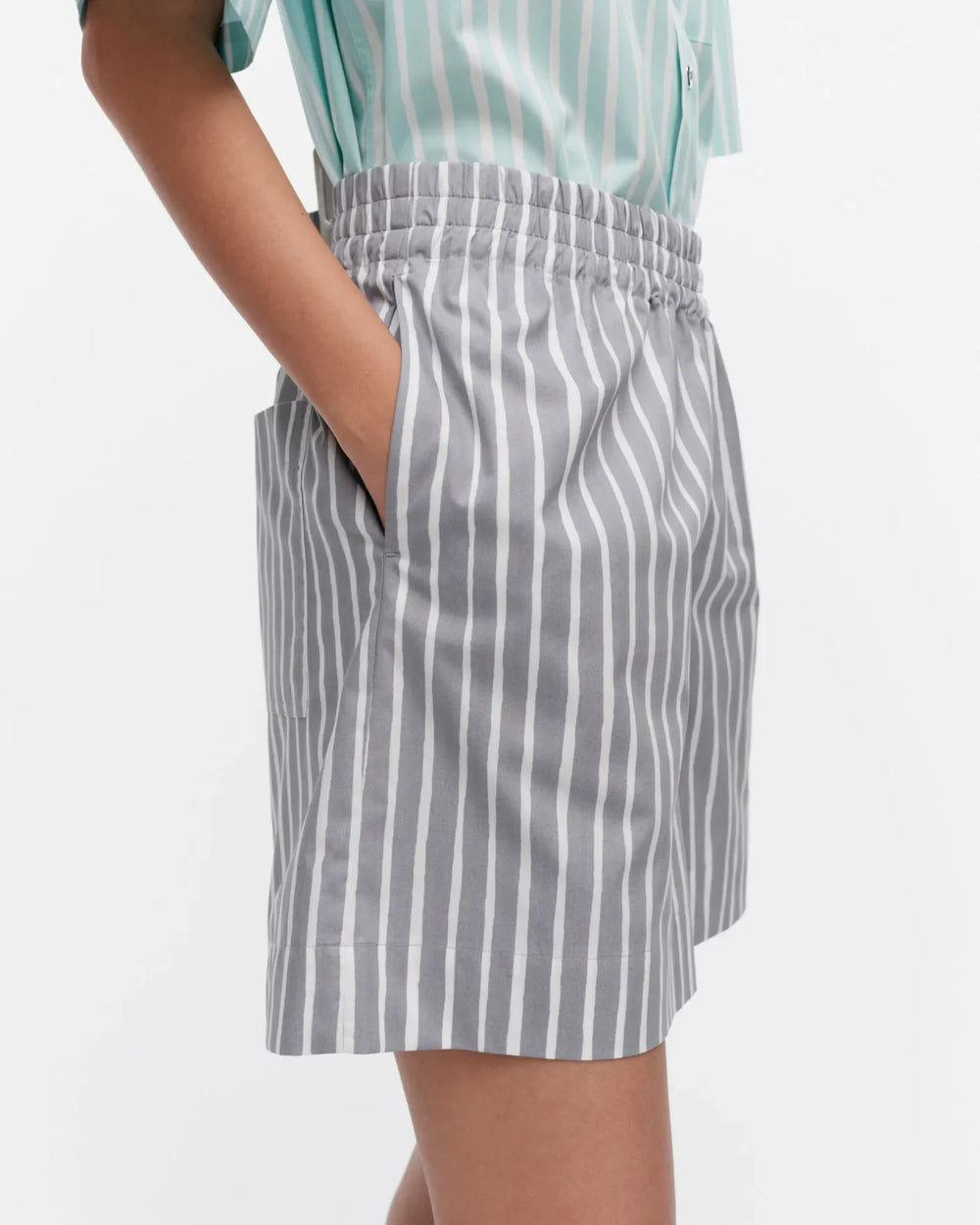 The Jokapoika cotton shorts feature the Piccolo pattern, which is printed in Helsinki. The shorts have an elastic waistband, side seam pockets, and one patch pocket in the back.