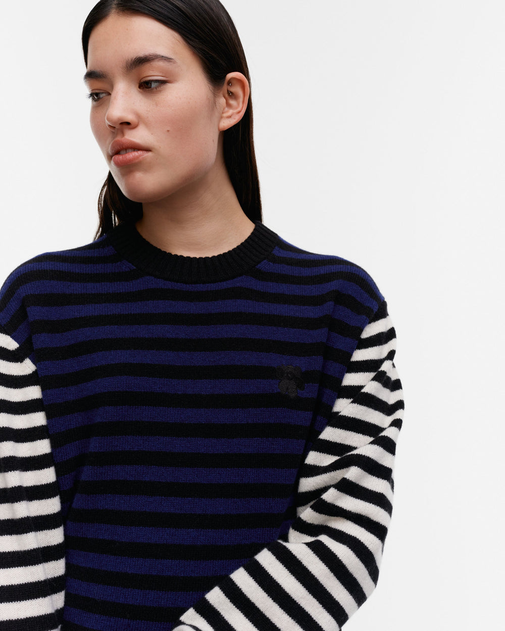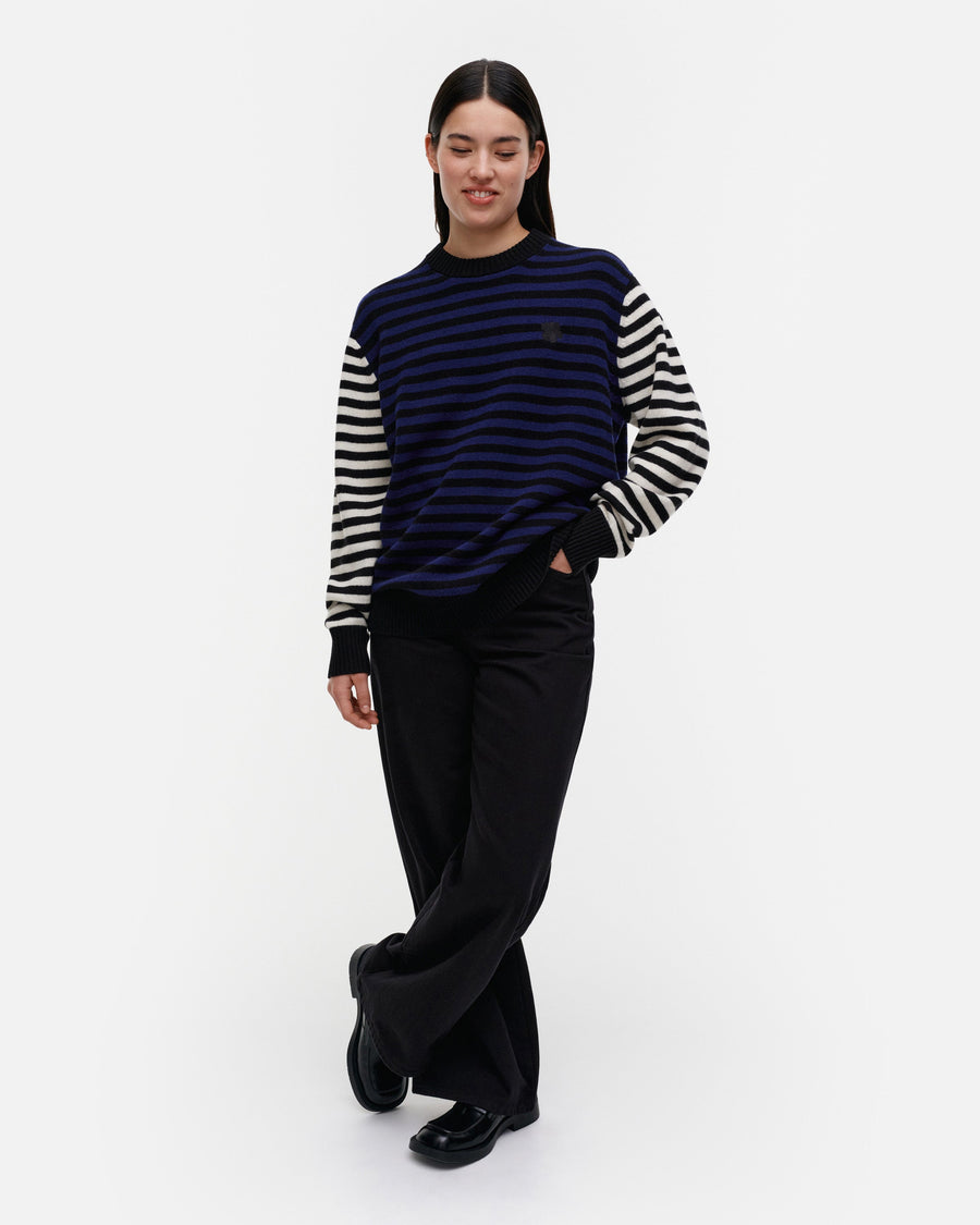 The men’s fit Pehmyt jumper is made of certified, soft lambswool. The jumper features the Tasaraita pattern with the body and the sleeves in different colors, and the small embroidered Unikko flower in the front. It has a double-ribbed O-neck and wide ribbing at the sleeve ends and hemline.