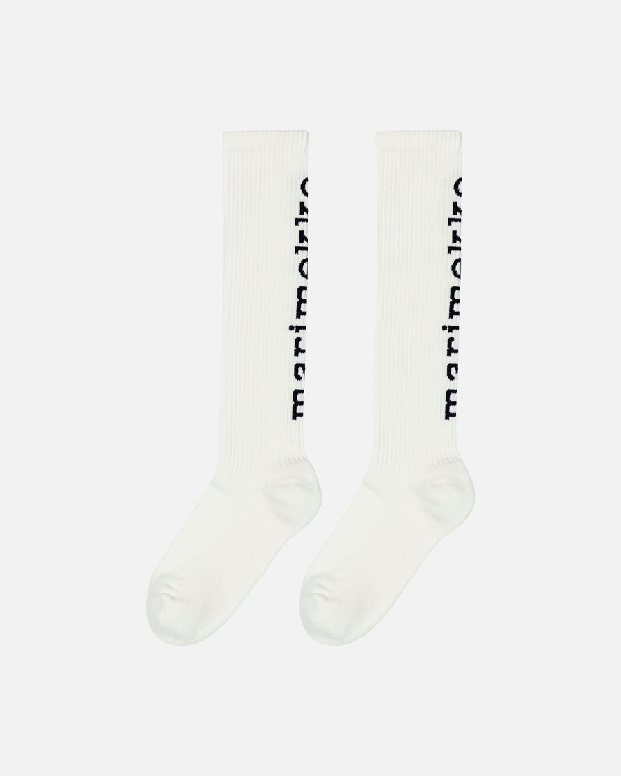 The Suikea knee high tennis socks are made of a cotton blend and they feature the Marimekko logo text on the back of the sock leg.