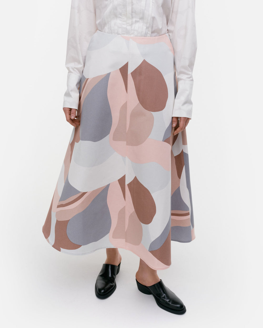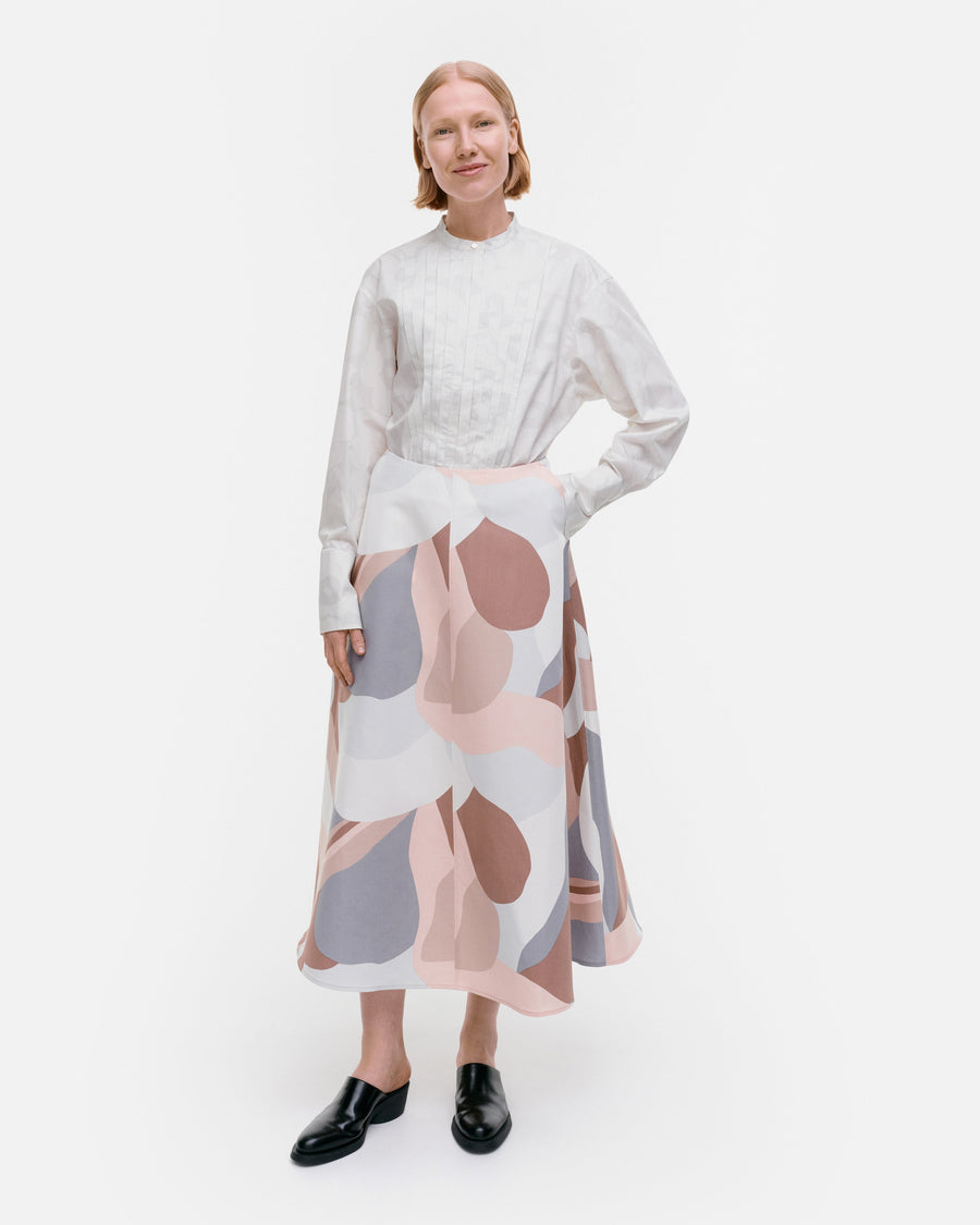 The Laita skirt is made of a cotton and linen blend, and it has a relaxed, A-line fit. The skirt features the Kamelia pattern and it has front and back central seams, a concealed zipper in the back, and slanted side pockets.