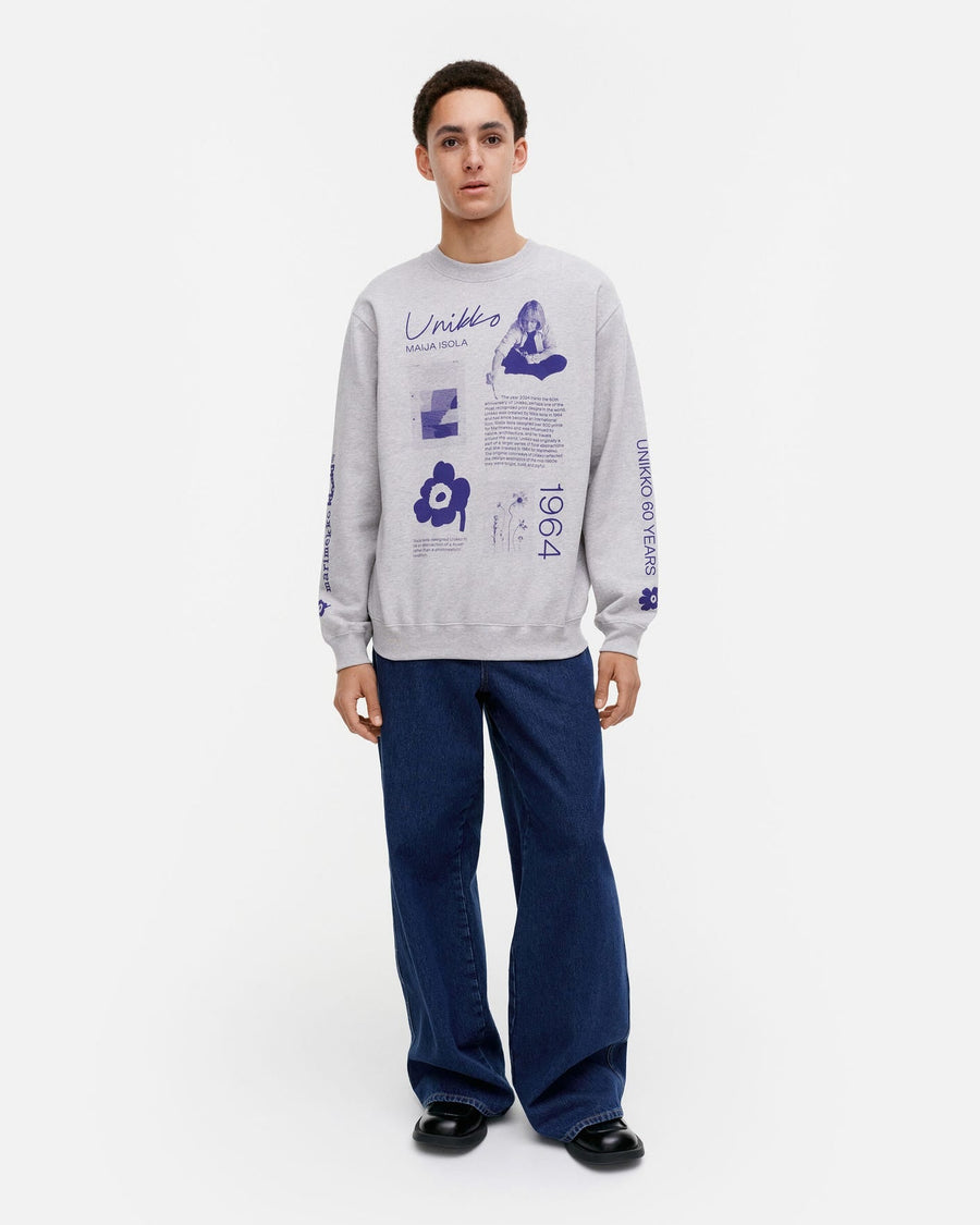 The men’s fit Loisto sweatshirt is made of organic cotton French terry. The Unikko Tribute print decorates the front of the sweatshirt and the sleeves. The sweatshirt has a rib O-neck and wide ribbing at the sleeve ends and hemline.