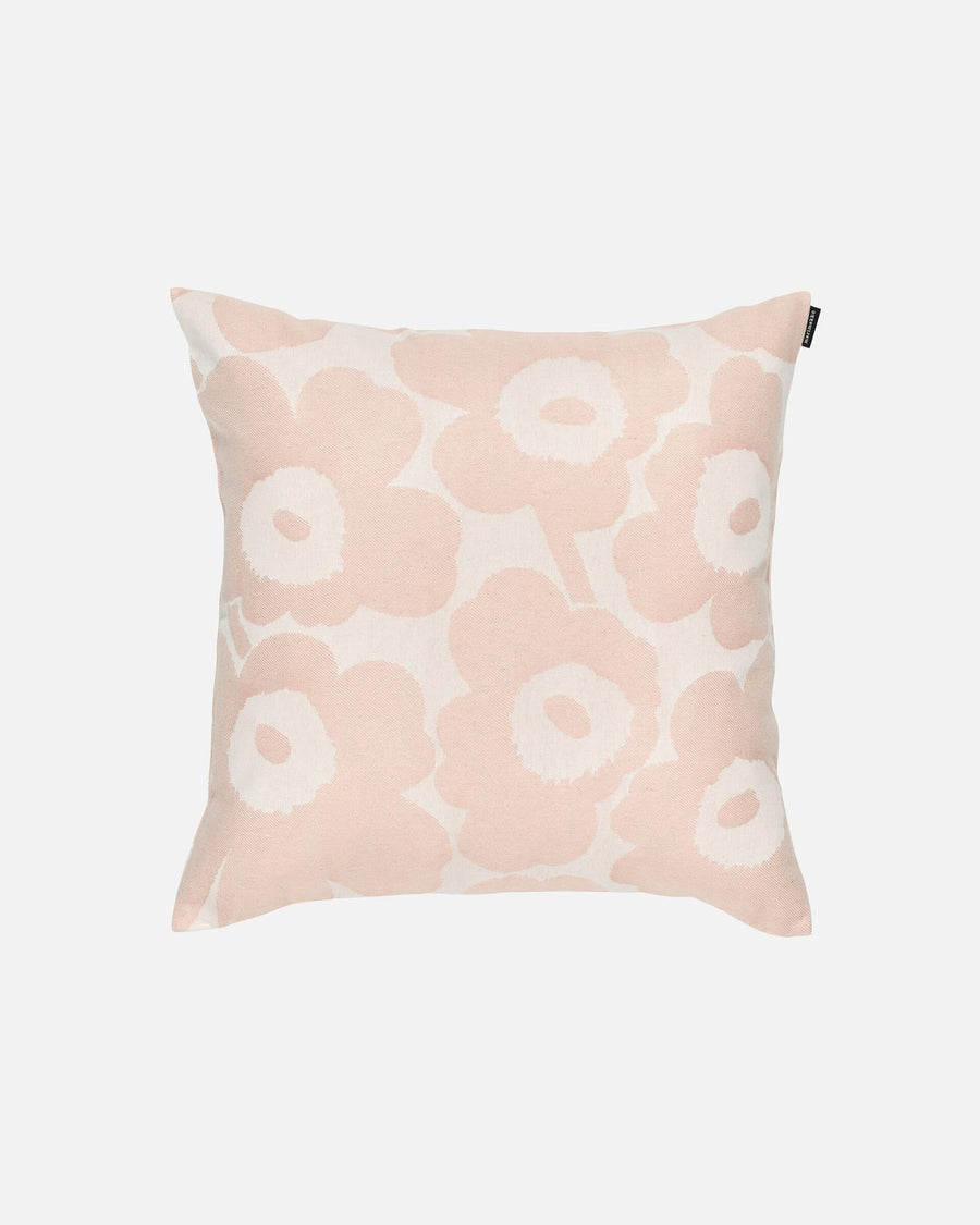 The Pieni Unikko pattern cushion cover is made of a cotton and linen blend with a jacquard knit. The cover has a concealed zipper on one side.