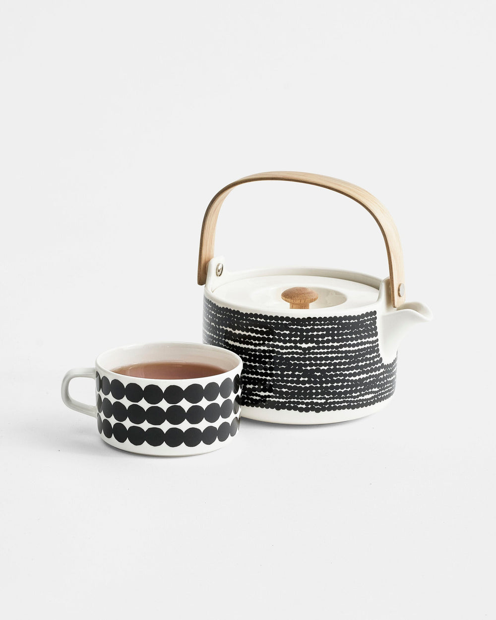 This wooden handle teapot features the graphic Rasymatto pattern designed by Maija Louekari. The pot, strainer and lid are made of white stoneware. Hand wash.