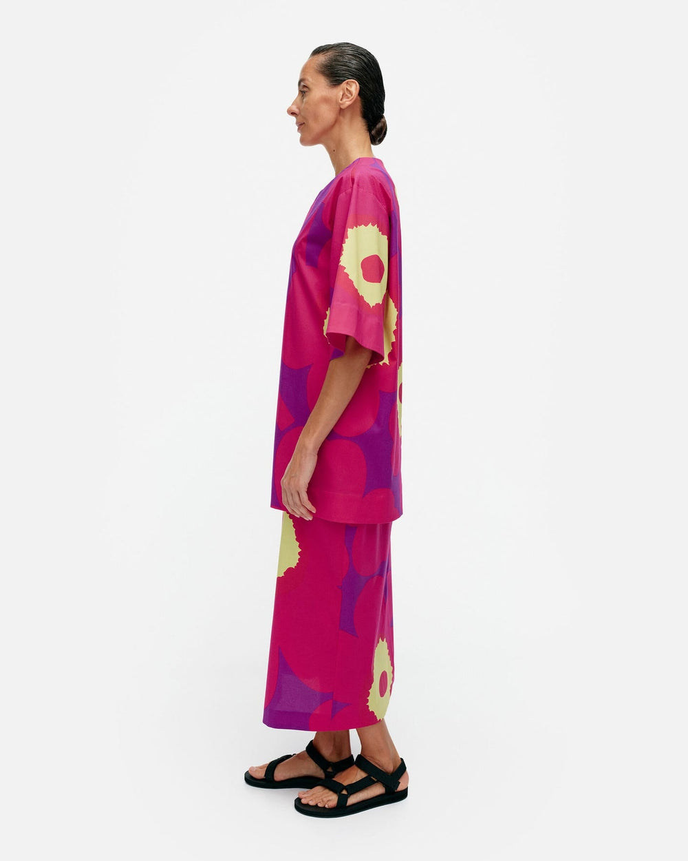 The Riite tunic is made of organic cotton twill, and it has a relaxed, straight fit and the Unikko pattern, which is printed in Helsinki. The product contains 4% elastane. The tunic has an O-neck with a small slit in the front, a central front seam, and bell-shaped, elbow-length sleeves. The fabric is printed in Helsinki.