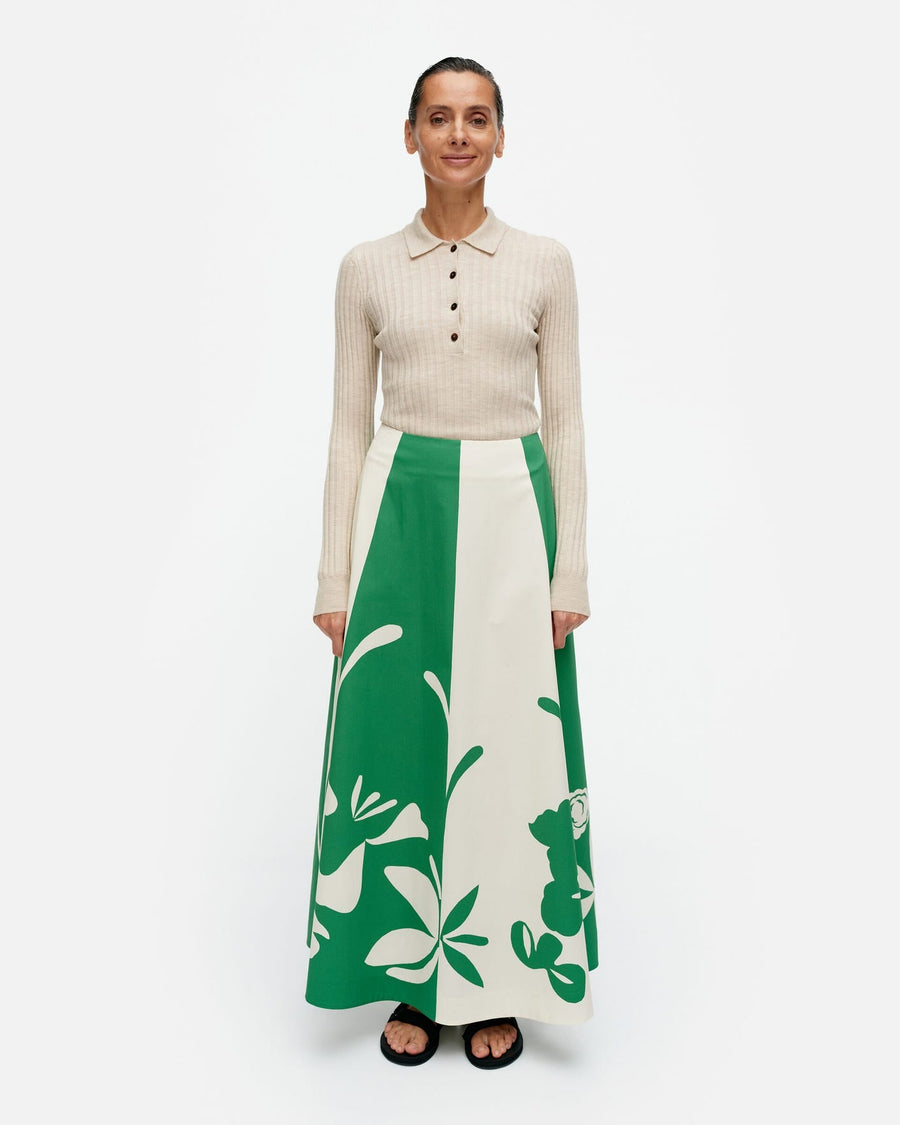 The Rönsy skirt is made of lightweight organic cotton twill, and it has a relaxed, A-line fit. The product contains 4% elastane. The skirt features the placement printed Nokturno pattern, a concealed zipper in the back seam, and side seam pockets.