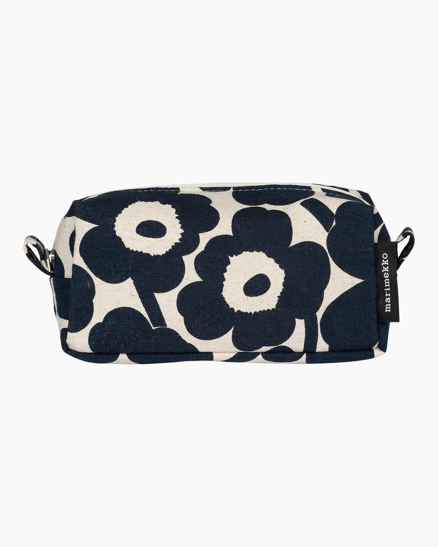 The Tiise cosmetic bag is made of an unbleached cotton and linen blend with a stain-repellent finish on the outside. The bag has a zipper closure and a nylon lining on the inside. The dark blue Mini Unikko (poppy) pattern is printed in Helsinki.