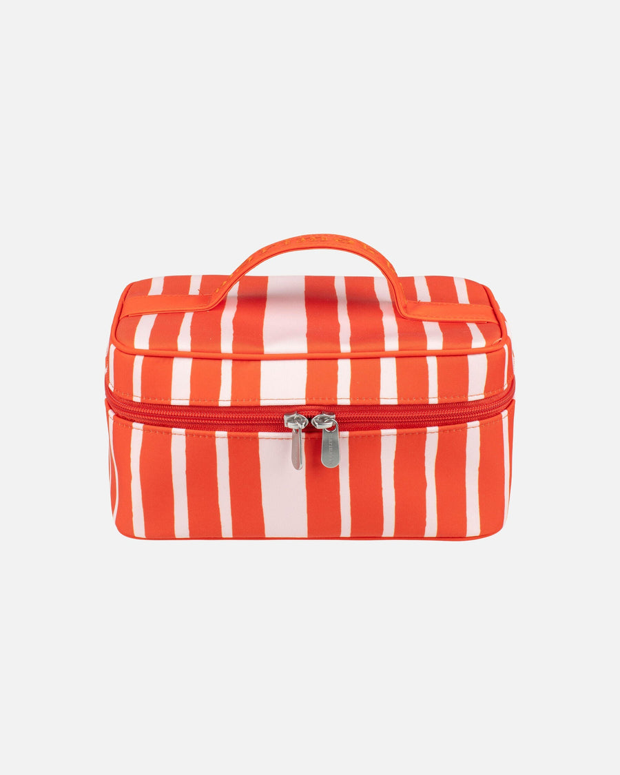 The Tuttu cosmetic bag is made of recycled polyester in the Raide pattern. The cosmetic bag has a handle on the lid and a zipper closure. It is lined on the inside and there are elastic bands to hold brushes in place.