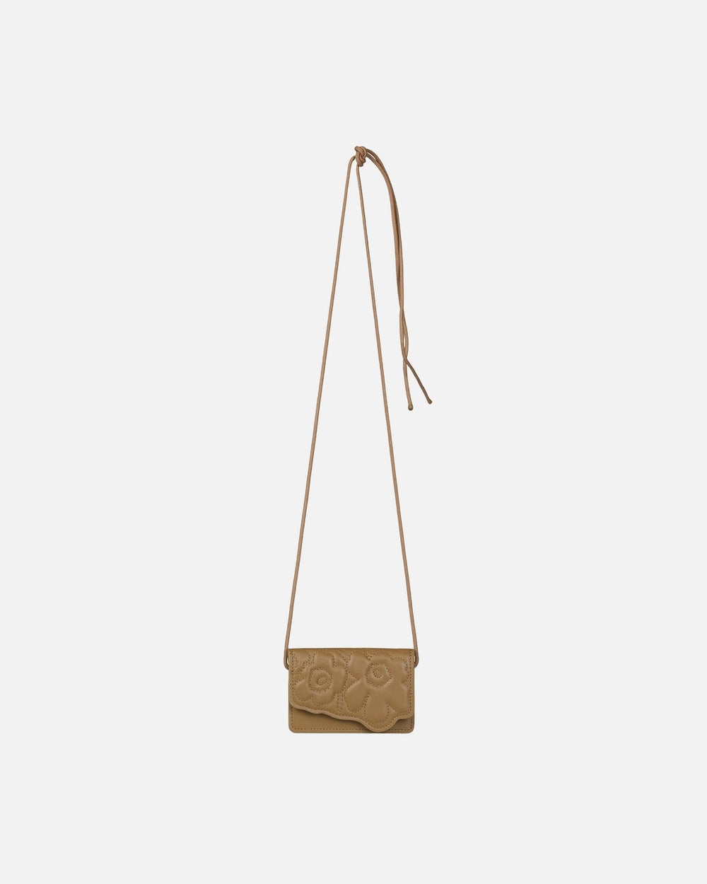 This belt bag is made of leather, and it has a padded lid, which features the topstitched Unikko pattern. The lid closes with a snap button and the bag has a cotton shoulder strap. The small belt bag carries your most important bank cards, and it can be worn several different ways: around the waist, around the neck, or across the shoulder.