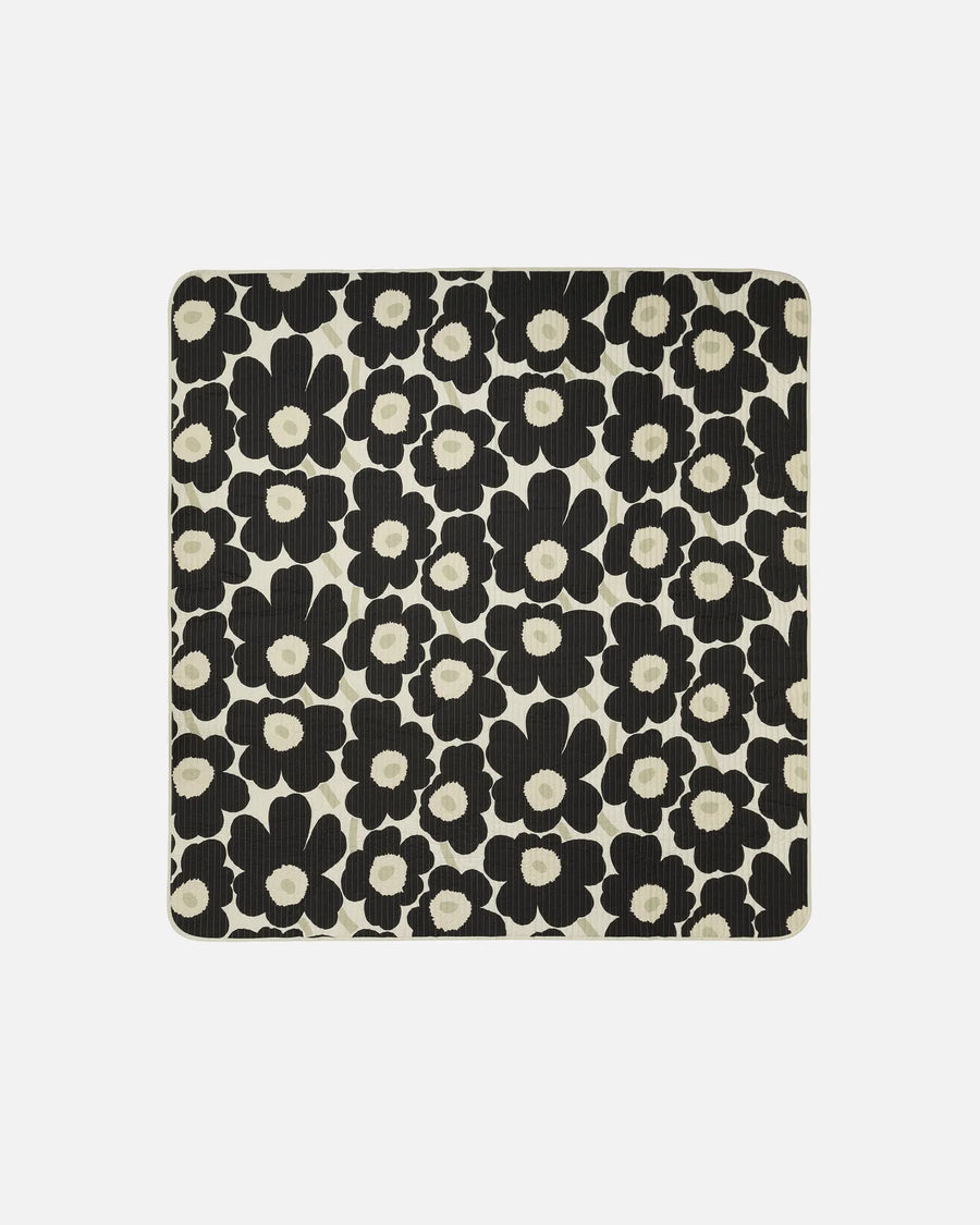 The quilted double bedspread is made of organic cotton with a recycled polyester padding. The bedspread is two-sided; one side features the Unikko pattern, and the other side is solid.