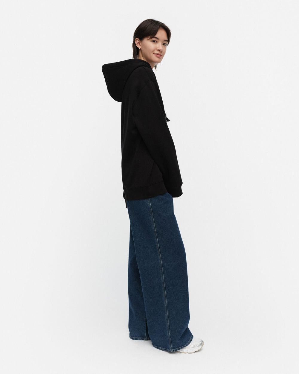 The Teesi French terry hoodie has a relaxed, unisex fit and it features the large Unikko flower print in the front, which looks like it was painted with watercolours. The hoodie has a drawstring hood and ribbing at the sleeve ends and hemline.