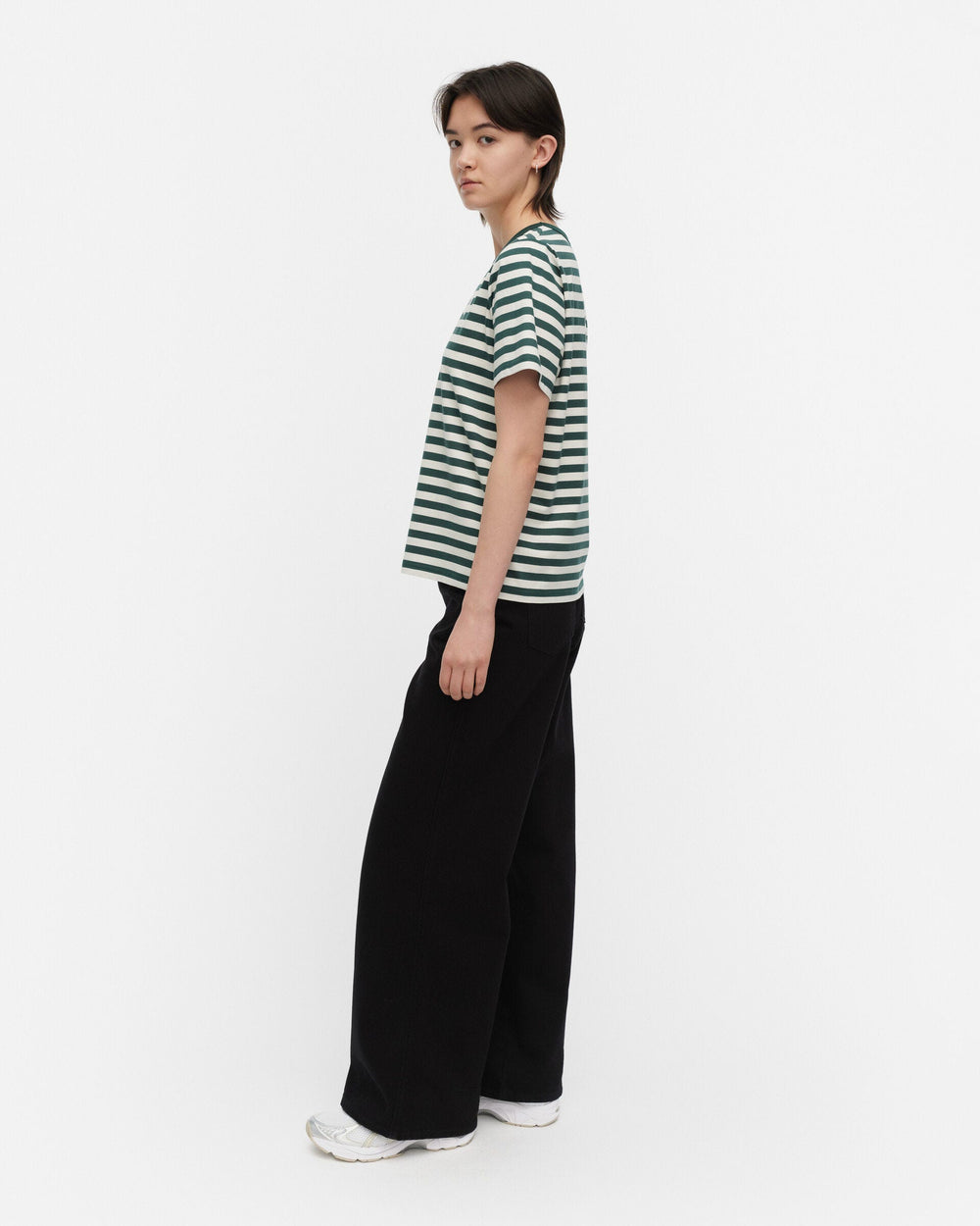 The relaxed fit t-shirt is made of organic cotton jersey, and it features the Tasaraita pattern as well as the small Unikko flower, which is printed in the front. The t-shirt has a ribbed O-neck.