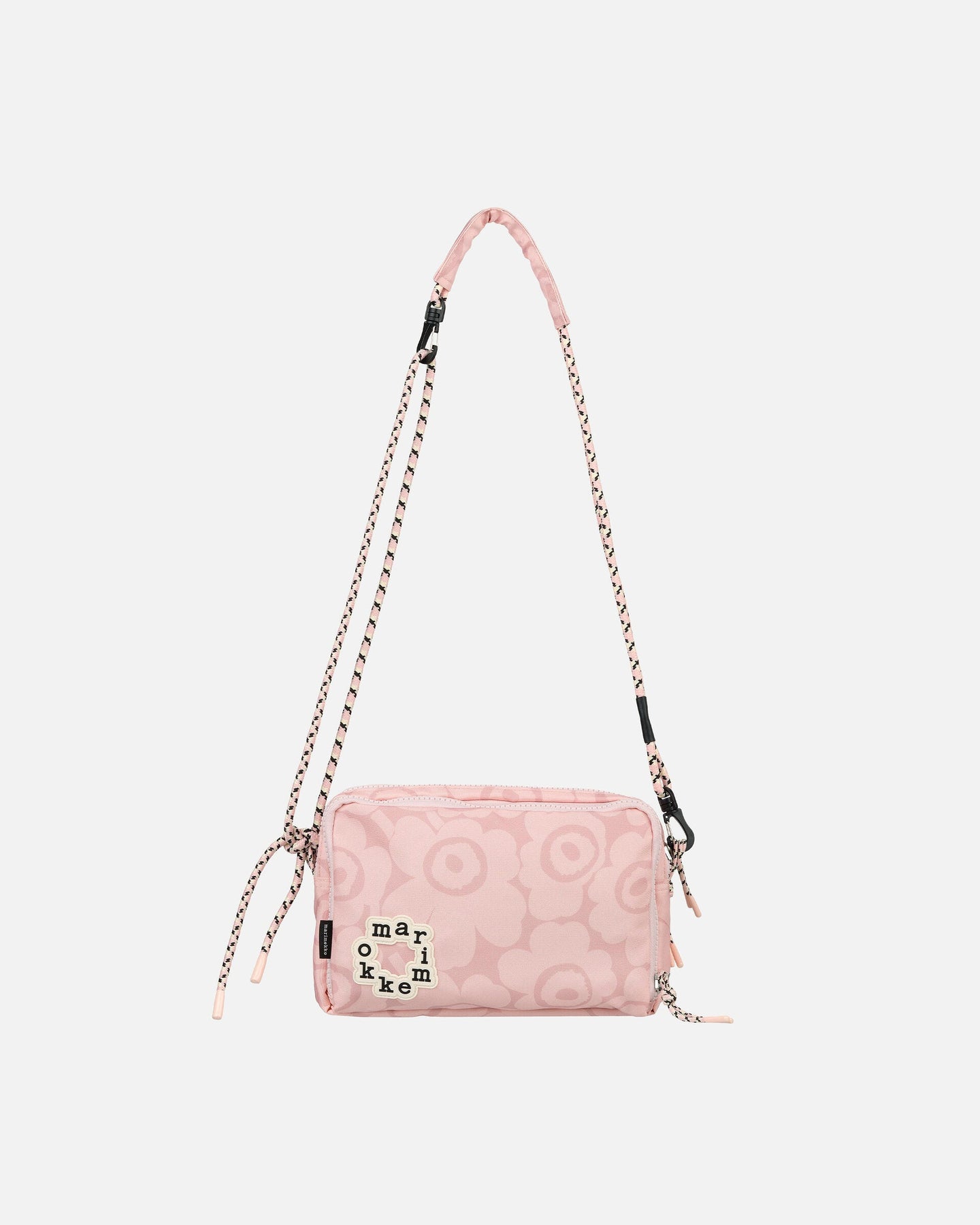 The Kavari shoulder bag features the Mini Unikko pattern. The bag has three different compartments, all with zipper openings and cord pullers. The front compartment features a mesh pocket on the inside. The bag has an adjustable shoulder strap and a cord loop on one side for hanging a keychain. The circular Marimekko logo patch sewn on the front is made of recycled silicone.