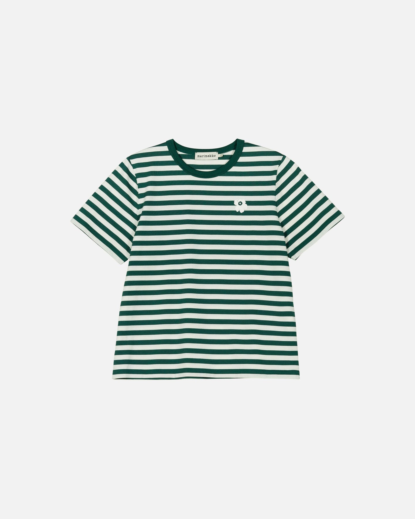 The relaxed fit t-shirt is made of organic cotton jersey, and it features the Tasaraita pattern as well as the small Unikko flower, which is printed in the front. The t-shirt has a ribbed O-neck.