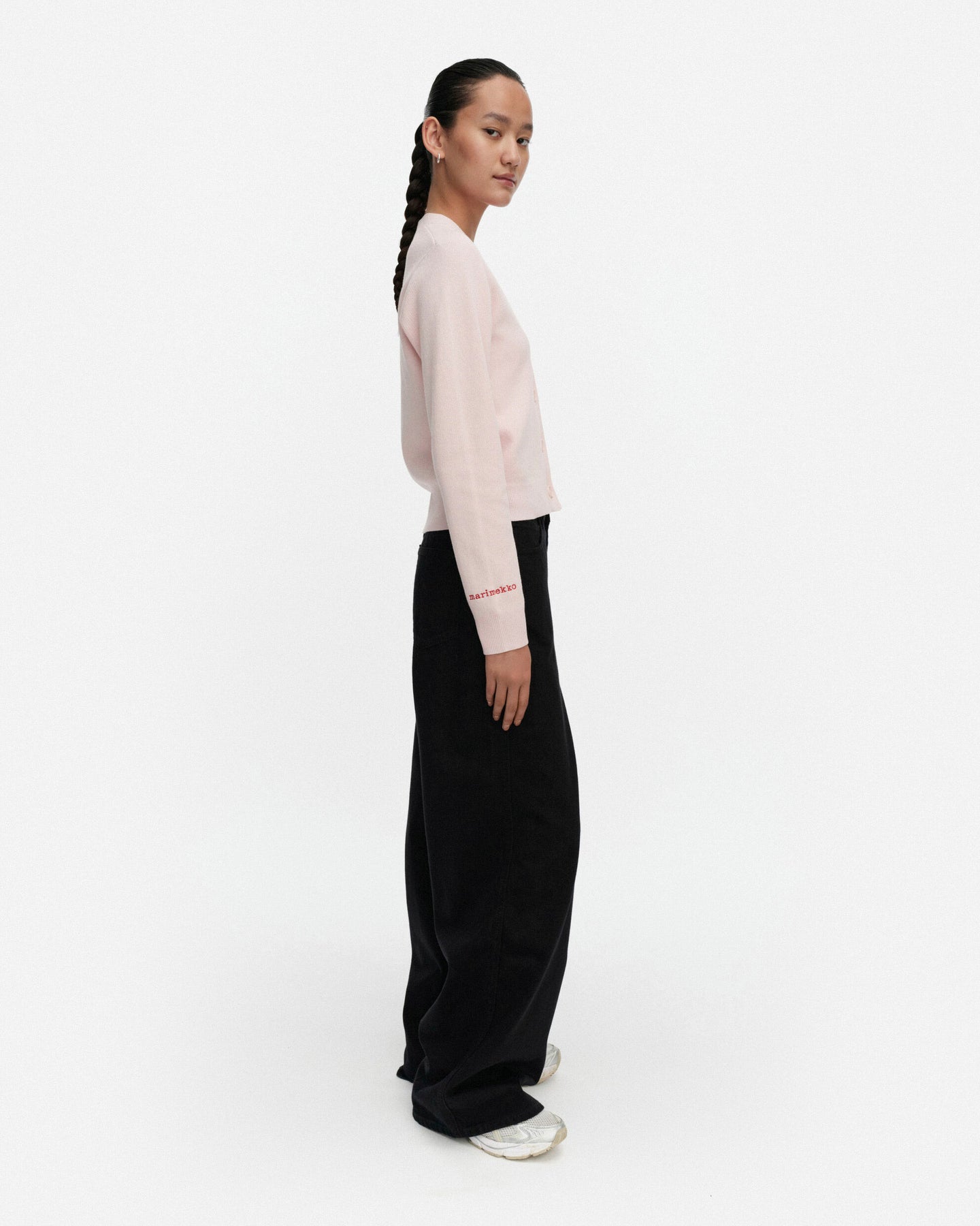The Lähelle cardigan has a slim, straight fit. The double-knit cardigan features the embroidered Musta Tamma pattern horse on the front left hem and the Marimekko logo on the right sleeve. It has a button closure and wide ribbing at the sleeve ends and hemline.