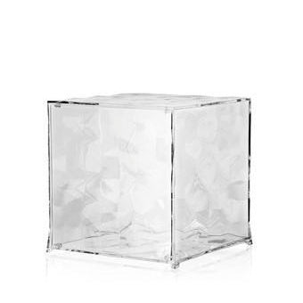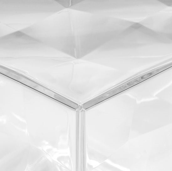 Optic is a container cube which comes in two versions: closed with a door or with one open side. Its surface is strikingly decorated with square based transparent or mirrored pyramids, slightly in relief, which create a strong visual impact. Optic measures 41 x 41 x 41 cm. and offers a myriad of potential combinations.