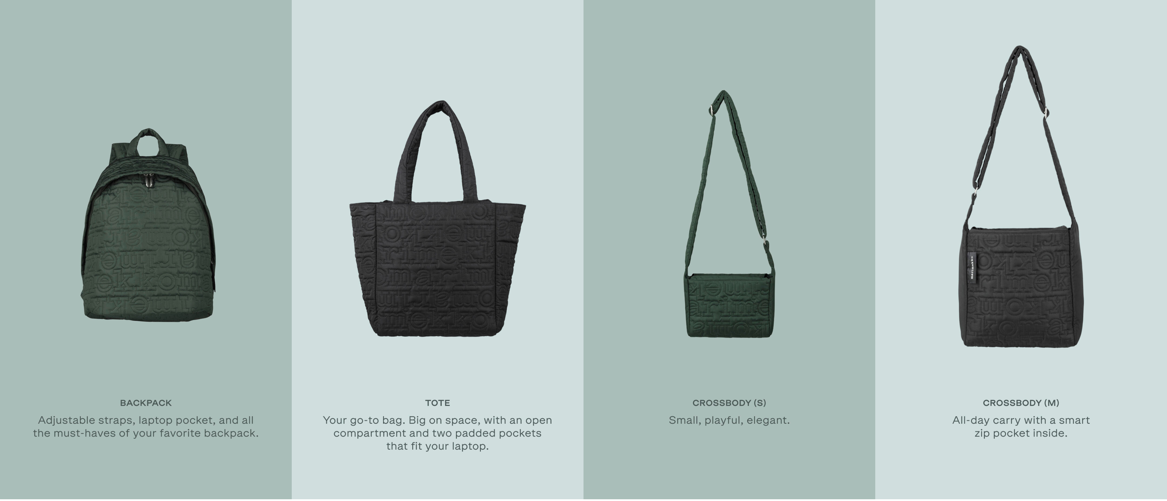 Putting the fun in functional. Joy is Marimekko’s new padded bag series crafted from recycled polyester. Four versatile styles in sleek black and deep green. Designed to go wherever life takes you.