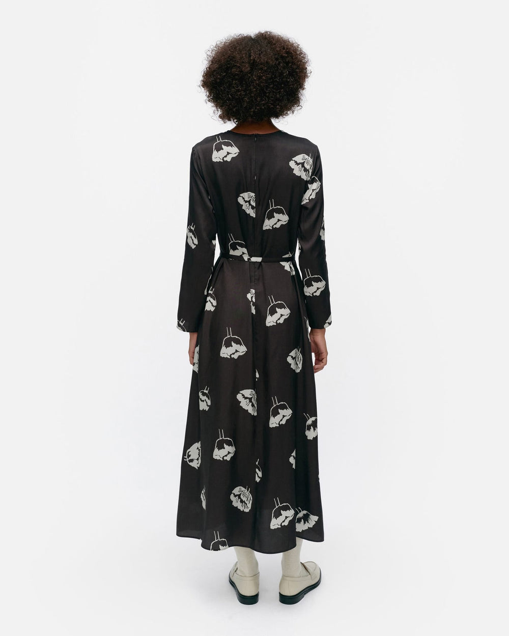 The Kaverus dress is made of a lyocell and viscose blend, and it has a slim, A-line fit. The dress features the Myski pattern, and it has an O-neck with a concealed zipper in the central back seam. The dress has long, slim sleeves, side seam pockets, and it comes with a separate D-ring belt.